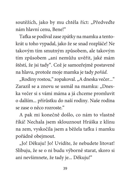 Klementýnka, bezelstná třeťačka s dobrým srdcem a talentem na průšvihy, nemá úplně nejlepší den. Když se doma objeví cedulka s nápisem Dnes se koná rodinná porada, je si jistá, že zase něco provedla. Ale co? Byla protivná na malého bratra? Žalovali na ni, že lajdá školu? Moc se cpe nezdravým jídlem? Všemožně se snaží vypátrat, co bude na programu porady, ale rodiče nechtějí předem nic prozradit, ani kdyby se rozkrájela nebo postavila na hlavu. A tak nezbývá než doufat, že rodiče konečně dostali rozum a slavnostně jí oznámí: „Klementýnko, koupíme ti gorilu!“
