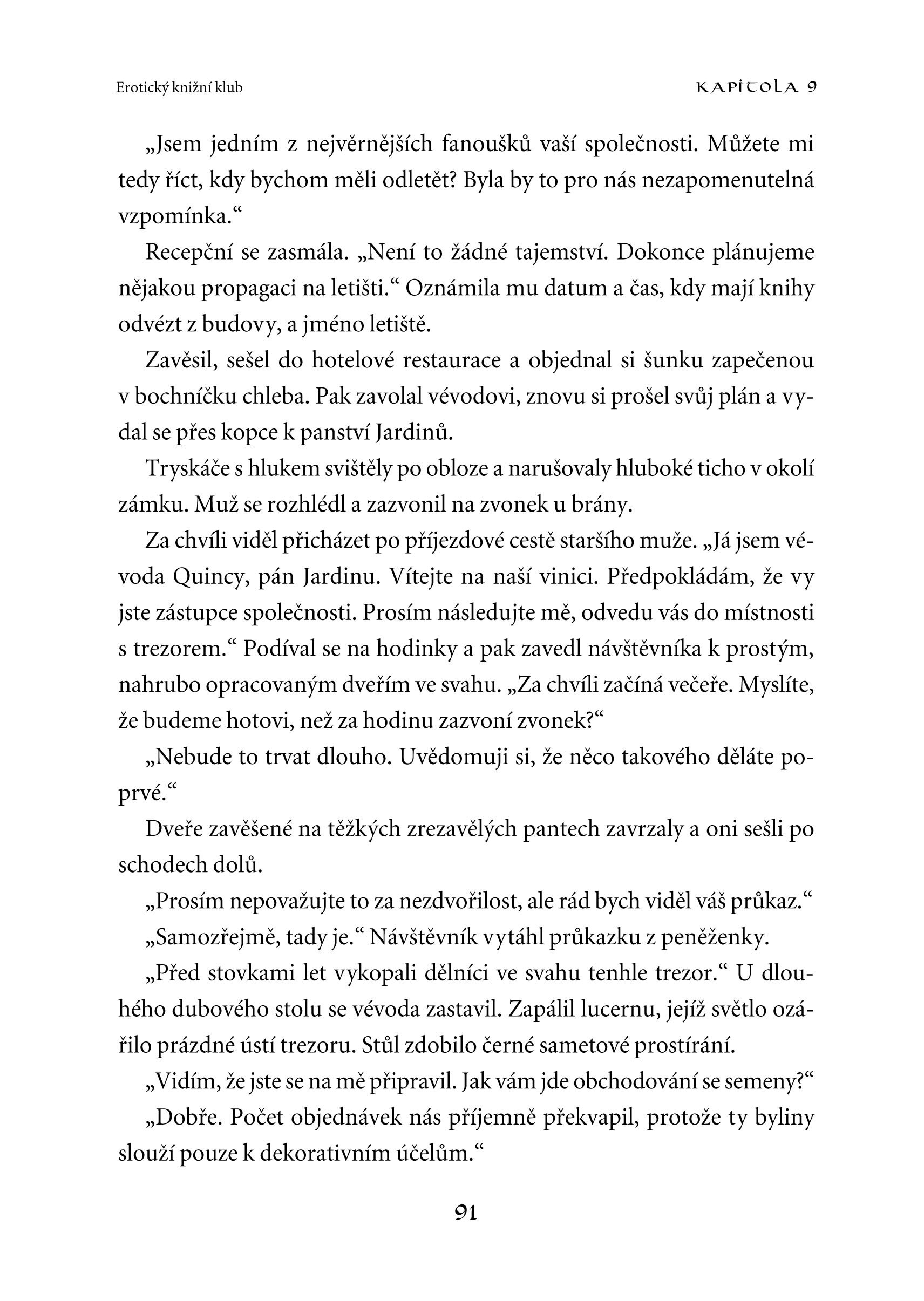 Lily, knihovnice s „bibliobusem“, přijíždí do malého kalifornského města, aby zde pomohla založit knižní klub. Na druhé straně oceánu, v alsaském zámku, je ukraden vzácný svazek starověkého lékařství, který je tajně odvezen až do Kalifornie. Do podezření se hned dostanou tři osamělé členky knižního klubu. Ty se - aniž by o krádeži tušily - věnují tajuplnému učení klasické erotiky a popíjejí podivné afrodiziakální čaje z bylinek vypěstovaných v cikánské zahradě. Záhadné události se brzy dají do pohybu. Městem otřásá vražda a ženy se zaplétají víc a víc do spletité záhady nebezpečí a smrti…