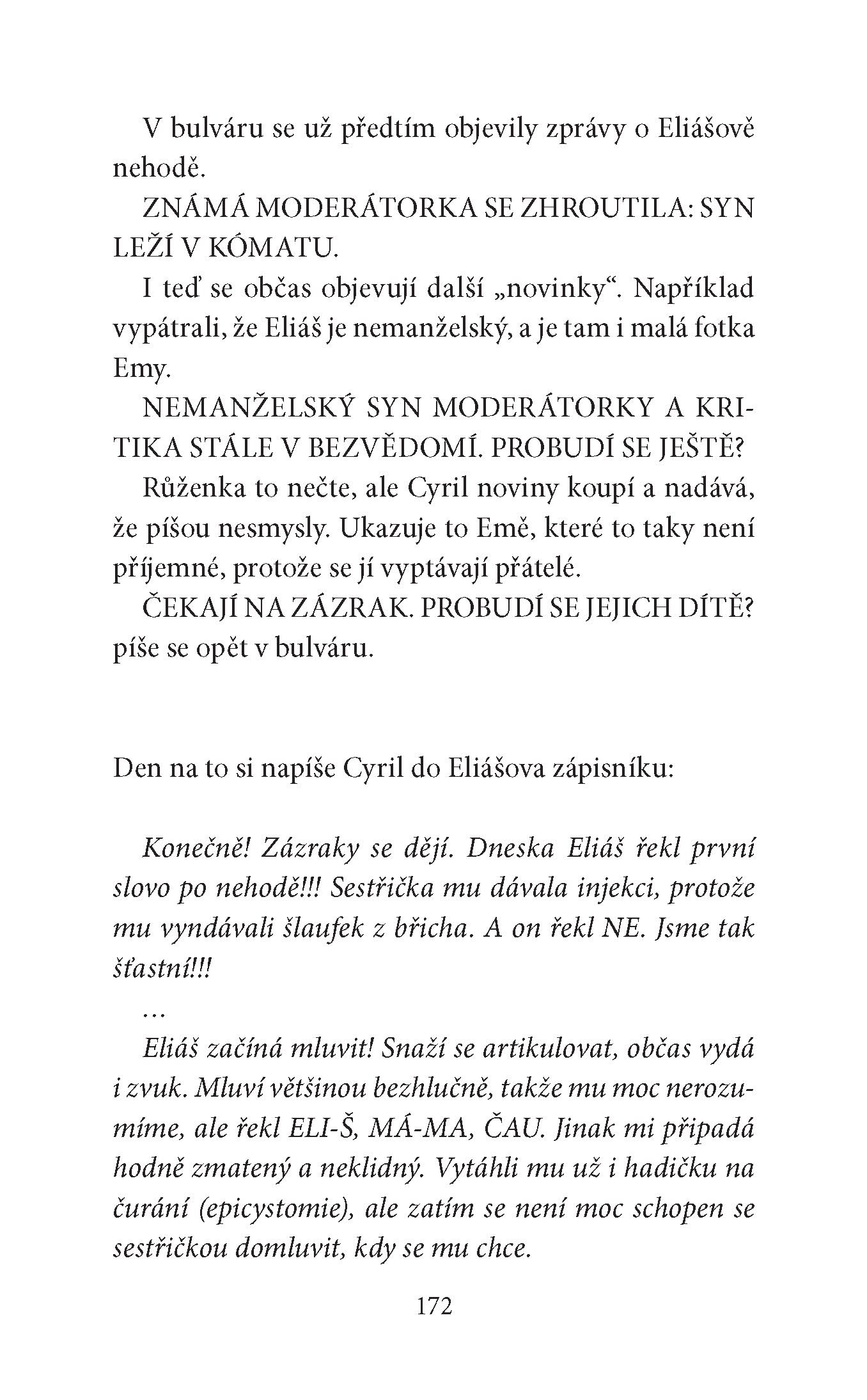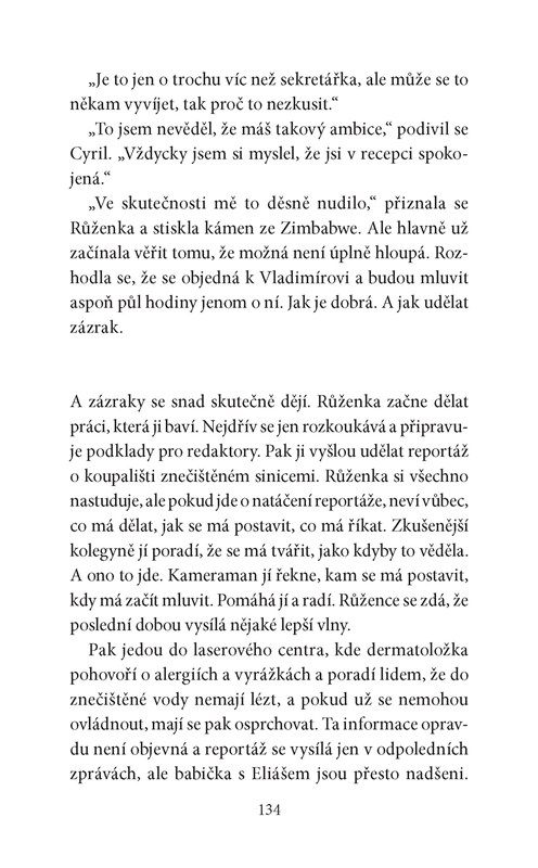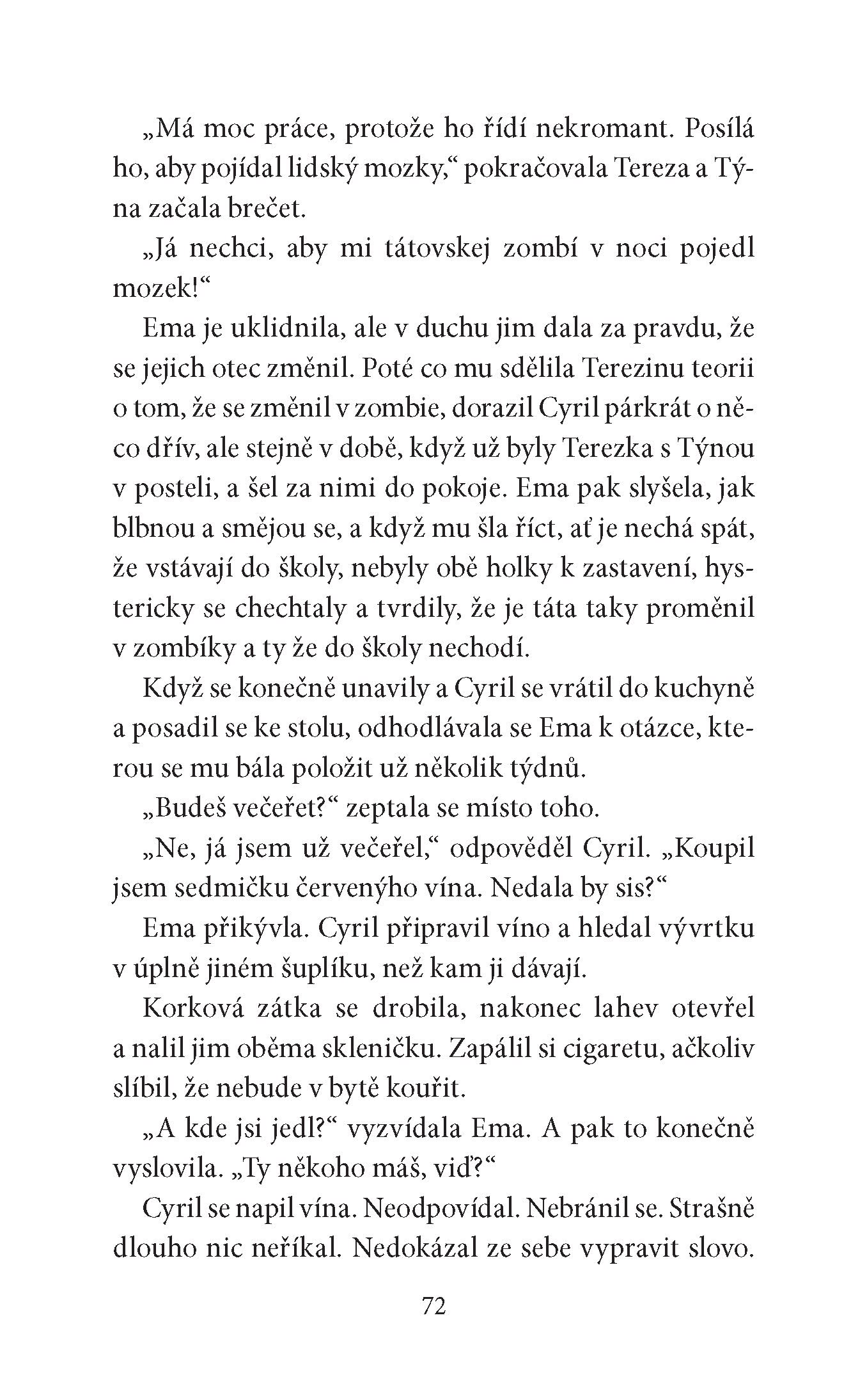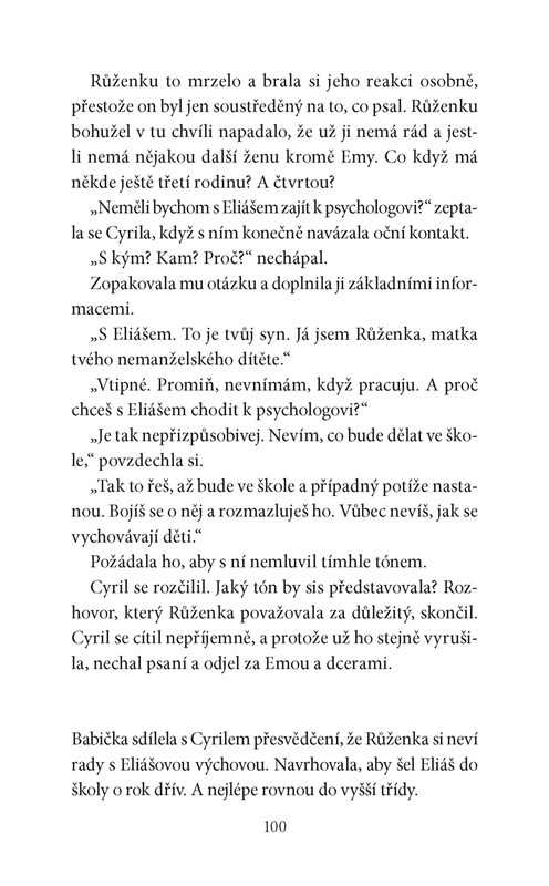 „Cyrile, ony tě ty dvě ženské vlastně mají ve střídavé péči,“ řekla mu jednou Olga. „Chápu, že tobě to vyhovuje, ale co ty dvě? Myslíš, že se jim to líbí? Jednou se stejně mezi nimi budeš muset doopravdy rozhodnout.“ O tom Cyril raději nepřemýšlel. Věci jsou takové, jaké jsou. Řešit se budou, až to bude nutné. Není pravda, že by mu to vyhovovalo. Nebyl na sebe pyšný a nelíbilo se mu, že musí lhát. Snažil se spíš říkat co nejméně, což mu šlo docela dobře, protože Ema i Růženka spíš mlčky trpěly, než by se s ním hádaly. V tom jediném si byly podobné. Pravda ale je, že střídavá péče o muže je docela výstižný termín.