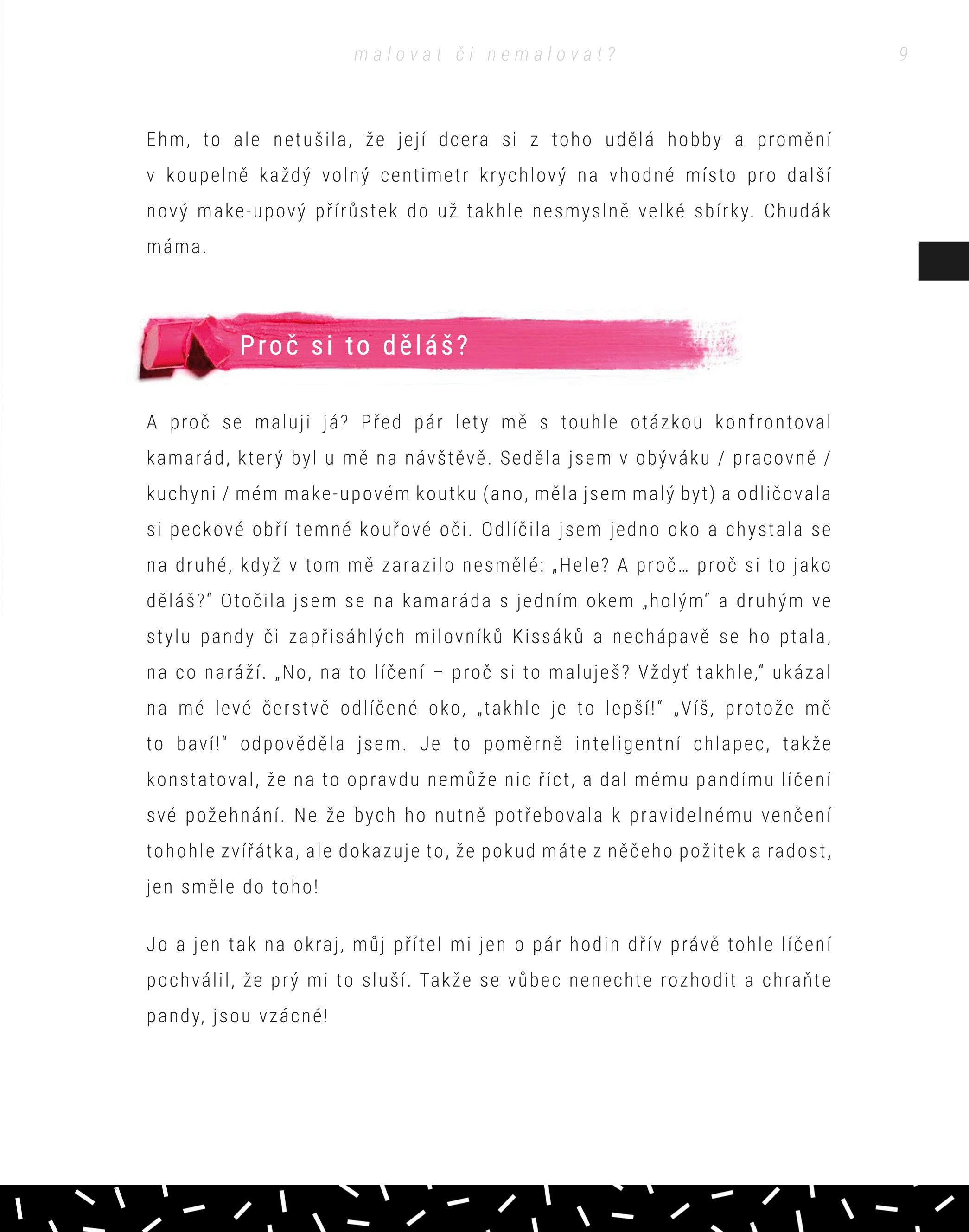 Tohle je knížka pro holky, dívky, ženy, maminky a klidně i babičky. Knížka, která zažene pochyby a strachy a pomůže vám v sobě objevit svobodné a kreativní já (v jakémkoli věku). Ulehčí vám orientaci v moři šminek, takže si z něj nakonec vyberete to, co opravdu potřebujete nebo chcete. Může to být jen pár kapek – třeba řasenka nebo lesk na rty, ale klidně i makeup, korektor, primer, bronzer, variace stínů, prostě cokoli, na co dostanete chuť. Probarví vaše dny, ty veselé a zářivé, i ty šedé, smutné a deštivé.