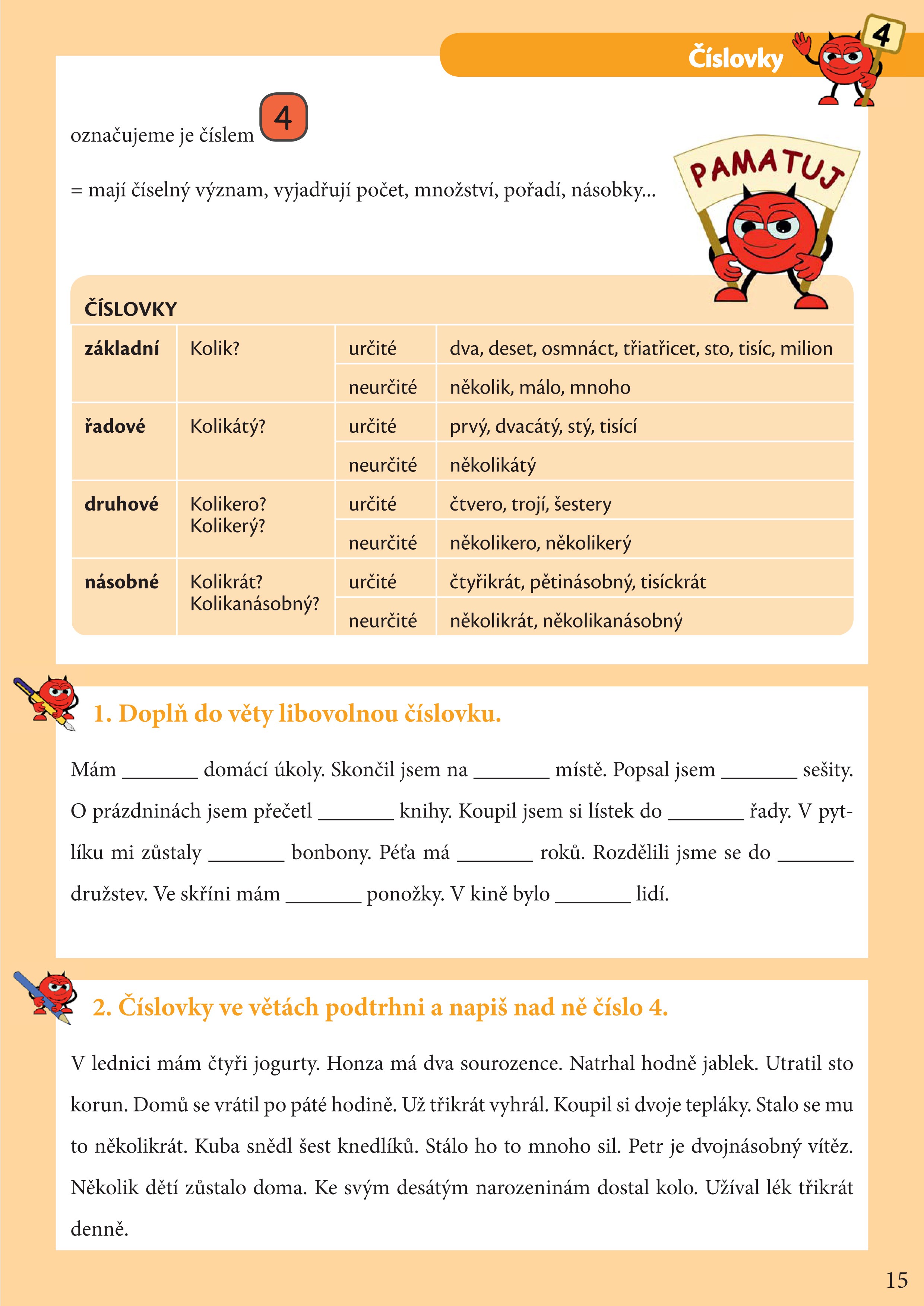 A zase vám chce pomáhat s učením. Tentokrát si spolu procvičíte určování slovních druhů. Čertík pro vás připravil cvičení na určování slovních druhů. Ale nejen to! Čertík Kvítko má další eso v rukávu. Vyčaroval pro vás kouzelné karty. Nebudete s nimi hrát klasické karetní hry, ale stejně to bude zábava. Kouzelné karty najdete v příloze knihy, vystřihněte si je, ať je můžete jednoduše používat. Na jedné straně karty je vždy zvýrazněné slovo pro určení slovního druhu a z druhé strany je obrázek se správnou odpovědí. Karty si budete postupně procházet a ty, které ještě neumíte, odložíte stranou a vrátíte se k nim ještě jednou nebo i víckrát. Uvidíte, že za chvíli budete umět určovat slovní druhy, jako když bičem mrská. To by v tom byl čert, abyste to s čertíkem Kvítkem nezvládli.