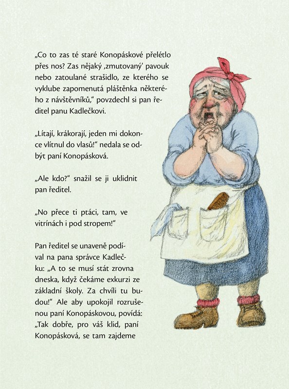 Vlaďka nejprve nevěří vlastním očím. Tohle všechno že způsobilo jen jedno barevné ptačí peříčko? Ale když si vyposlechne všechny ty neuvěřitelné příběhy a navíc zjistí, že ředitel má za úkol otevřít novou sbírku, odhodlává se k činu. Není totiž muzeum jako muzeum. A v tom Vlaďčině se dějí opravdu prapodivné věci!