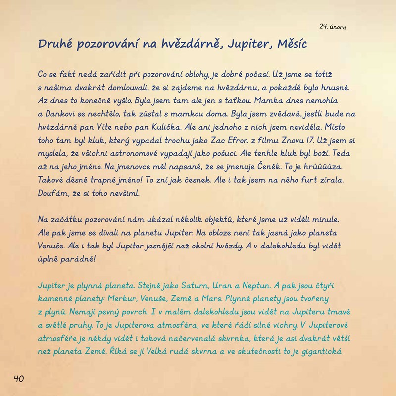 Hanka dostala od babičky deník. Ačkoliv se jí zprvu nechce, začíná si do něj psát každodenní zážitky. A protože ji zajímá noční obloha, její zápisky se stále víc zaobírají právě astronomickými poznatky. Vydejte se společně s ní na cestu ke hvězdám a zaznamenejte vlastní pozorování!