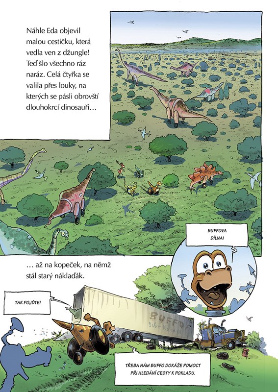 Malé velosaury Boba, Edu a Tinu spojuje nejen kamarádství, ale i touha po dobrodružství. Když jim vychytralý obchodník Konrád nabídne ke koupi mapu k pokladu, neváhají ani na chvíli. Babička Emilka totiž bude mít narozeniny, a pokud poklad najdou, budou jí moct nadělit nějaký úžasný dárek, na který teď nemají dost peněz.