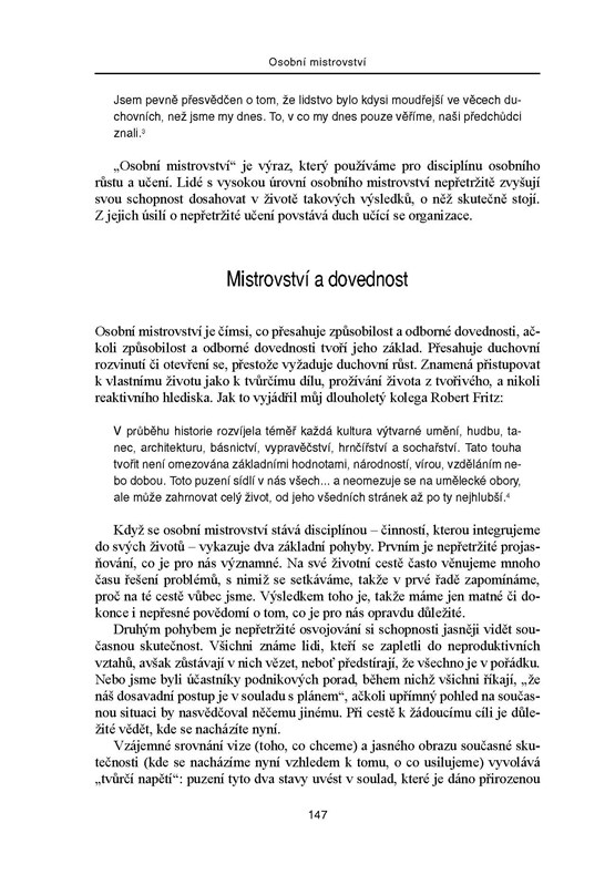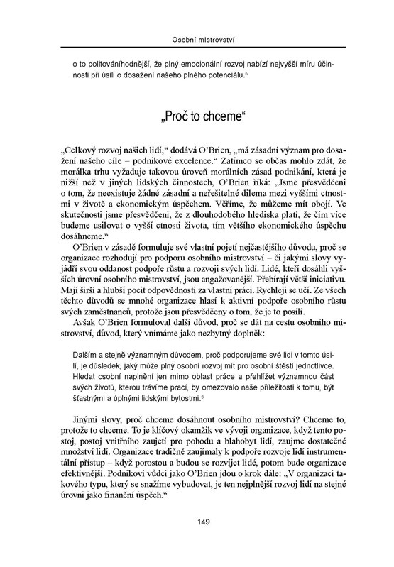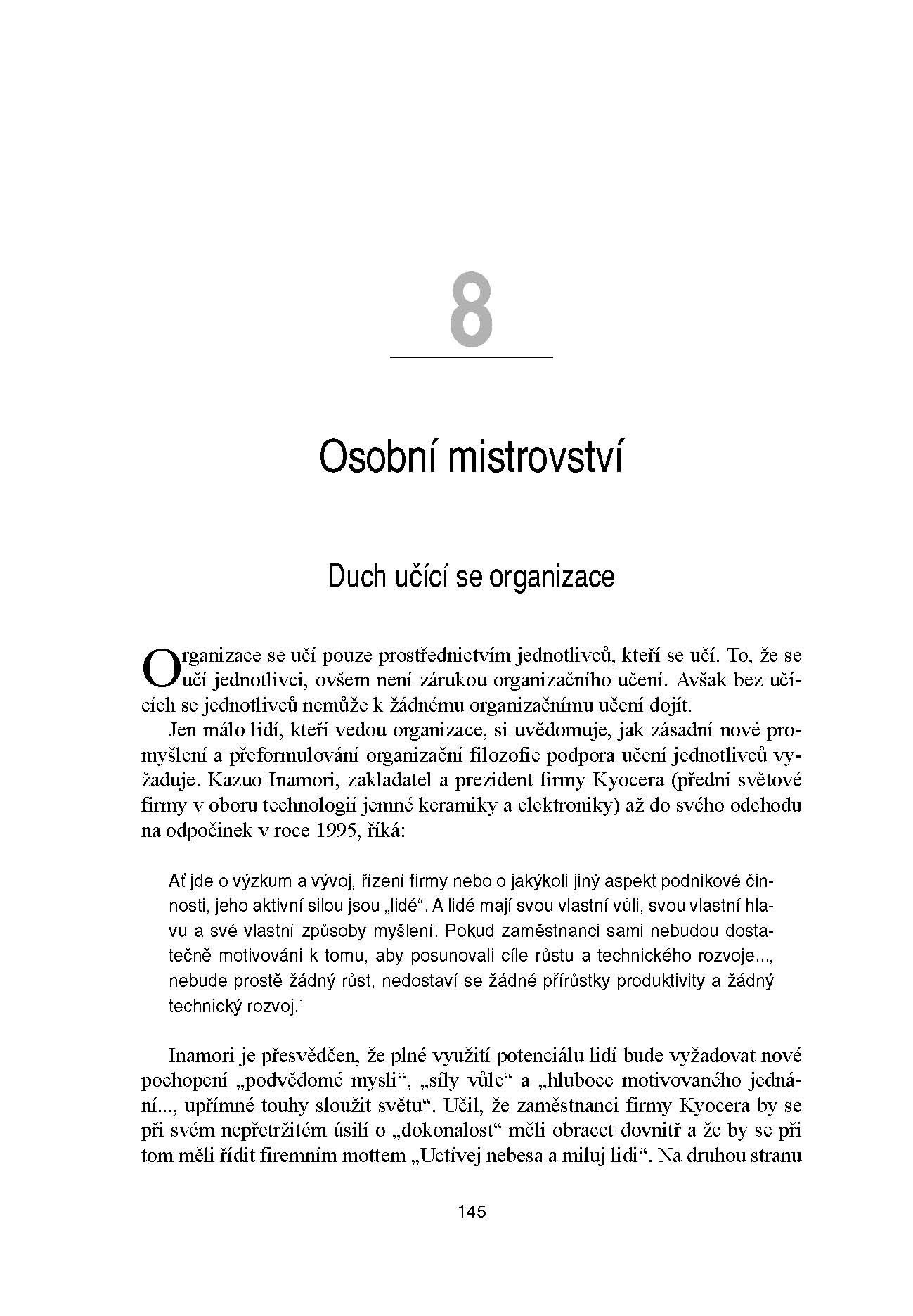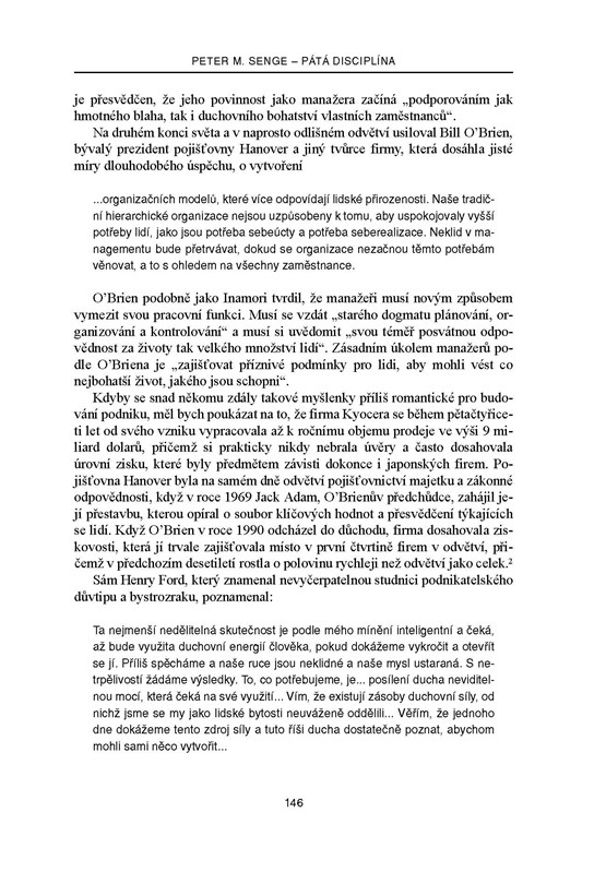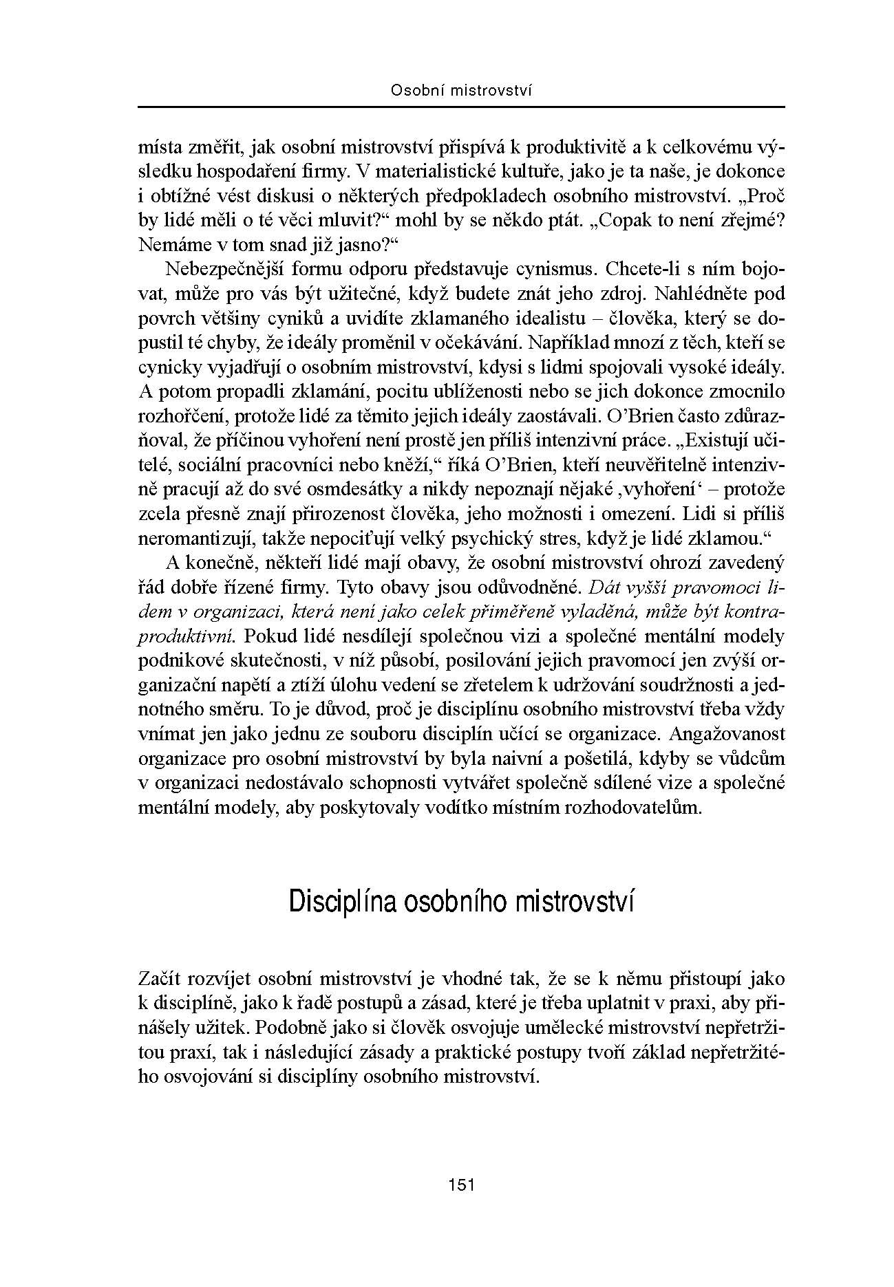 Aktualizované vydání bestselleru Petera M. Sengeho – jedné z nejvýznamnějších osobností v oboru managementu – lze bez nadsázky zařadit mezi klasická díla světové manažerské literatury. Vychází z patnácti let zkušeností s uplatňováním hlavních myšlenek knihy v praxi a dokazuje, že jedinou konkurenční výhodou, kterou může organizace získat, je schopnost učit se rychleji než konkurence. Popisuje, jak se organizace mohou zbavit „poruch učení“, které ohrožují jejich produktivitu a úspěch, a to tím, že si osvojí strategie, jež uvolňují týmové úsilí, rozvíjejí nový způsob myšlení a schopnost lidí dosahovat výsledků, na nichž jim opravdu záleží.