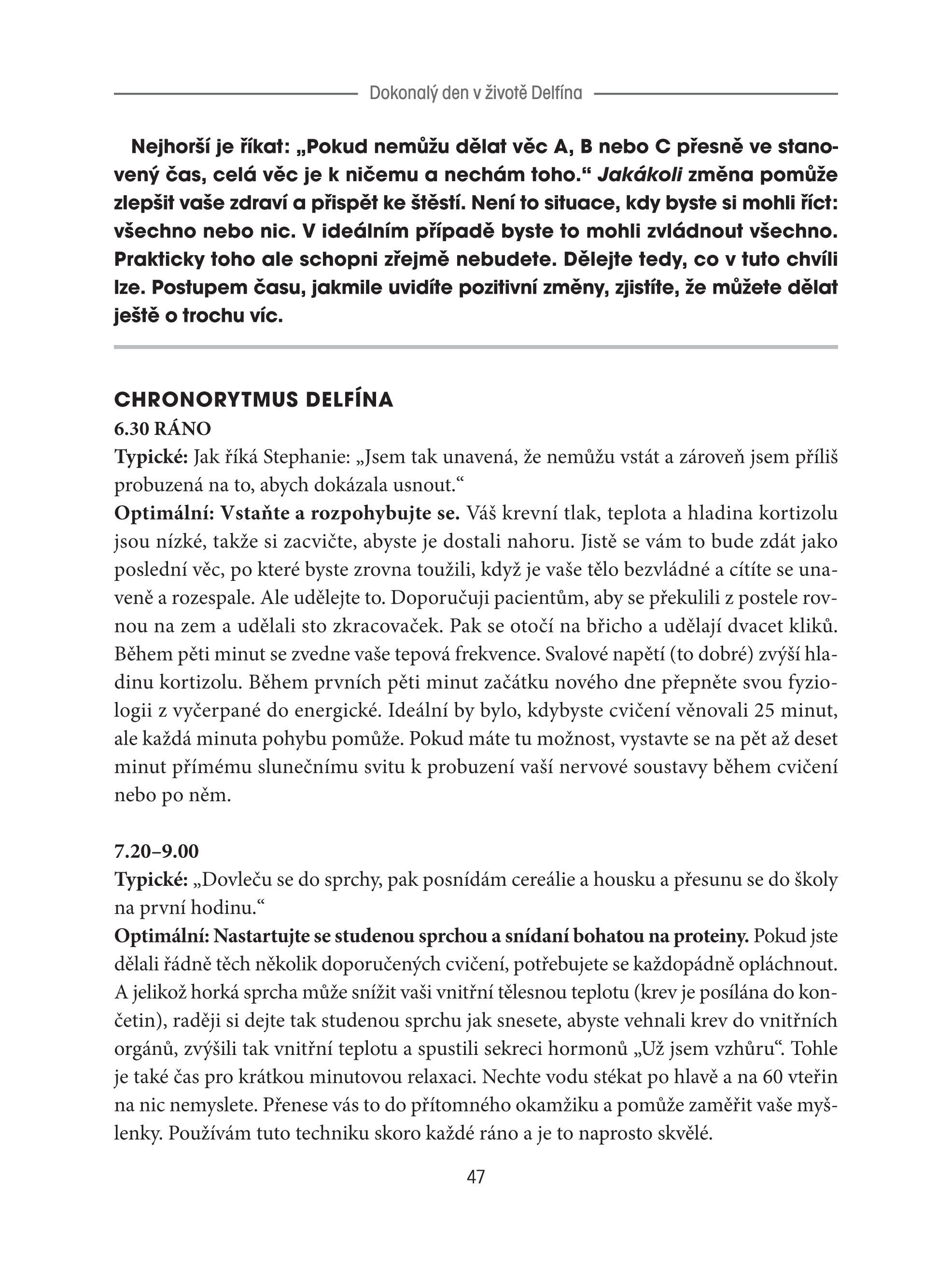 Knihu otevírá biočasový dotazník, v němž vám klinický psycholog a spánkový odborník Michael Breus pomůže určit osobní chronotyp. Ať už jste Medvěd, Lev, Delfín anebo Vlk, další stránky nabídnou inspiraci, jak sladit více než 50 běžných aktivit s vaším vnitřním nastavením a poskládat si tak rozvrh pro váš ideální den.
