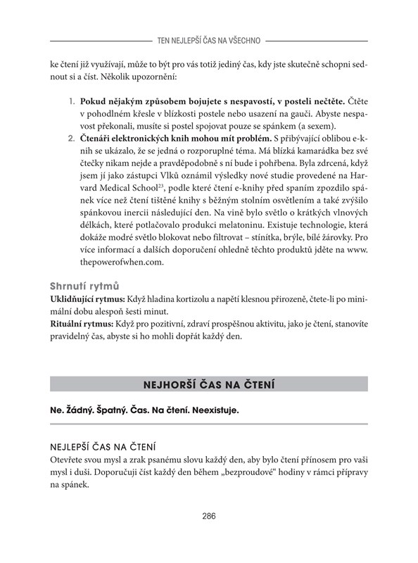 Kniha Síla správného okamžiku pracuje s vnitřními hodinami, které má každý z nás v sobě. Díky správnému načasování aktivit můžete být efektivnější, šťastnější, můžete lépe odpočívat a naplno využít svůj potenciál. Slaďte se se svým přirozeným rytmem. Často stačí jen pár drobných změn, a uvidíte velké rozdíly.