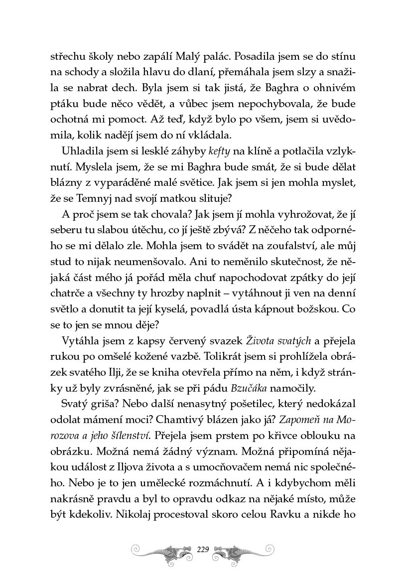 Alina se snaží Temnyjovým nástrahám vzdorovat. Přesto se do nich zaplétá a vzdaluje se od lásky, v níž až doteď hledala své útočiště. Nic není zadarmo, a ona s palčivou naléhavostí cítí, že jestli chce Ravku zachránit, bude si muset vybrat. Ponechá si svoji výjimečnou moc a zachrání zemi, nebo se jí vzdá, bude poslouchat svoje srdce, a zvolí lásku?