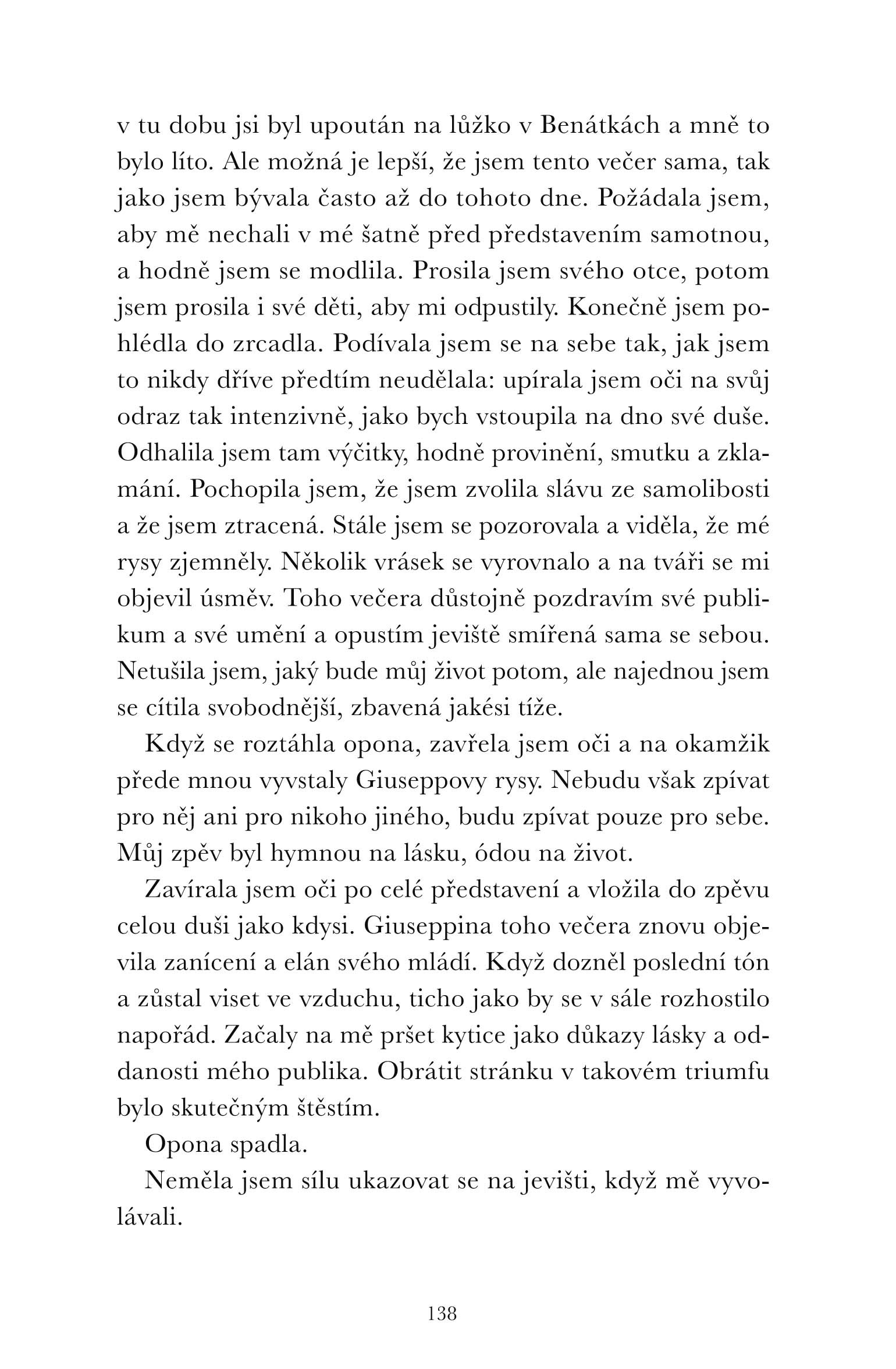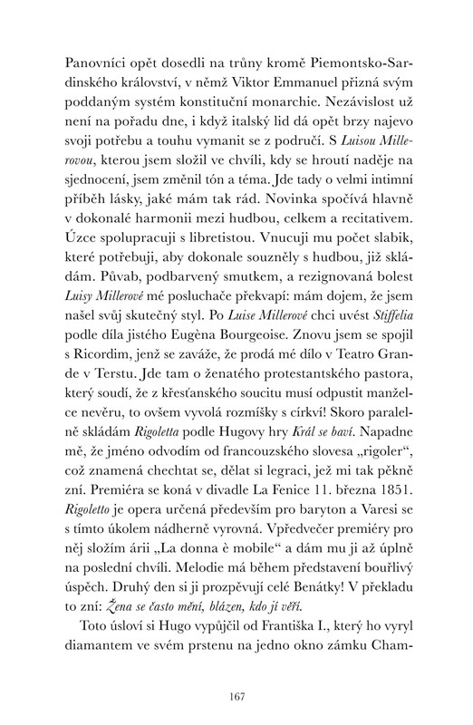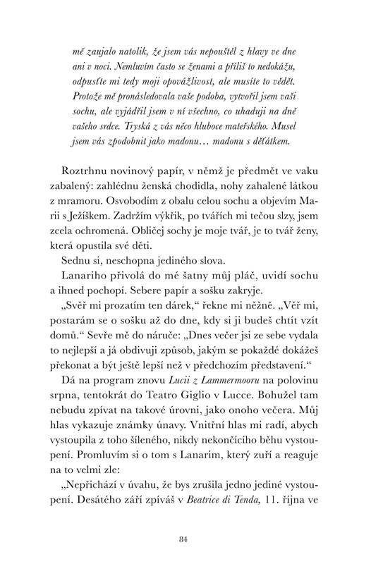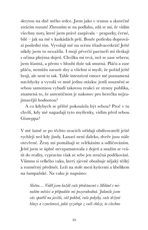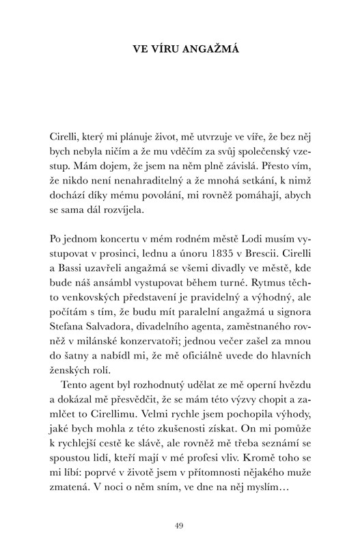 Životopisný román o bouřlivém životě a láskách slavné operní pěvkyně a manželky Giuseppa Verdiho, Giuseppiny Strepponiové-Verdiové.