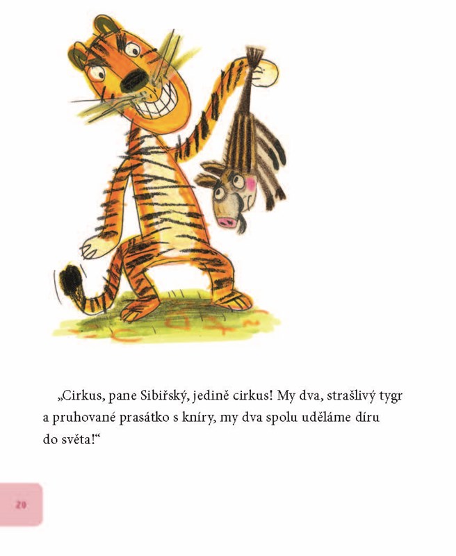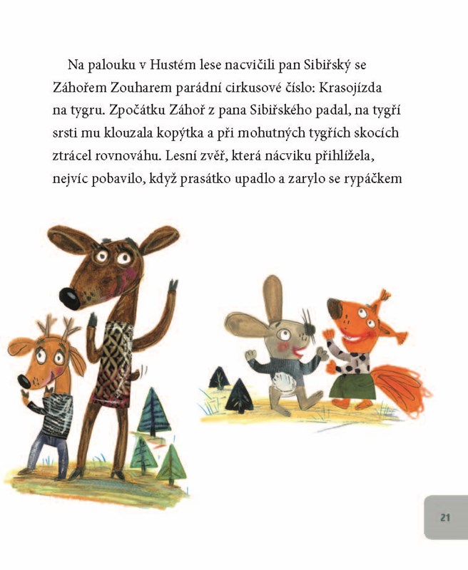 Záhoř je jedno moc milé pruhované prasátko. Na světě to ale nemá jednoduché – nejdřív na něj málem nepřišel, pak mu narostly kníry, a ještě ho ulovil strašlivý, i když skoro bezzubý tygr, pan Sibiřský. Ale nakonec, snad protože jsou pruhovaní, se ti dva spolu spřátelí, a dokonce udělají kariéru u cirkusu. Bezzubý tygr a fousaté prasátko, jak tohle jenom dopadne?