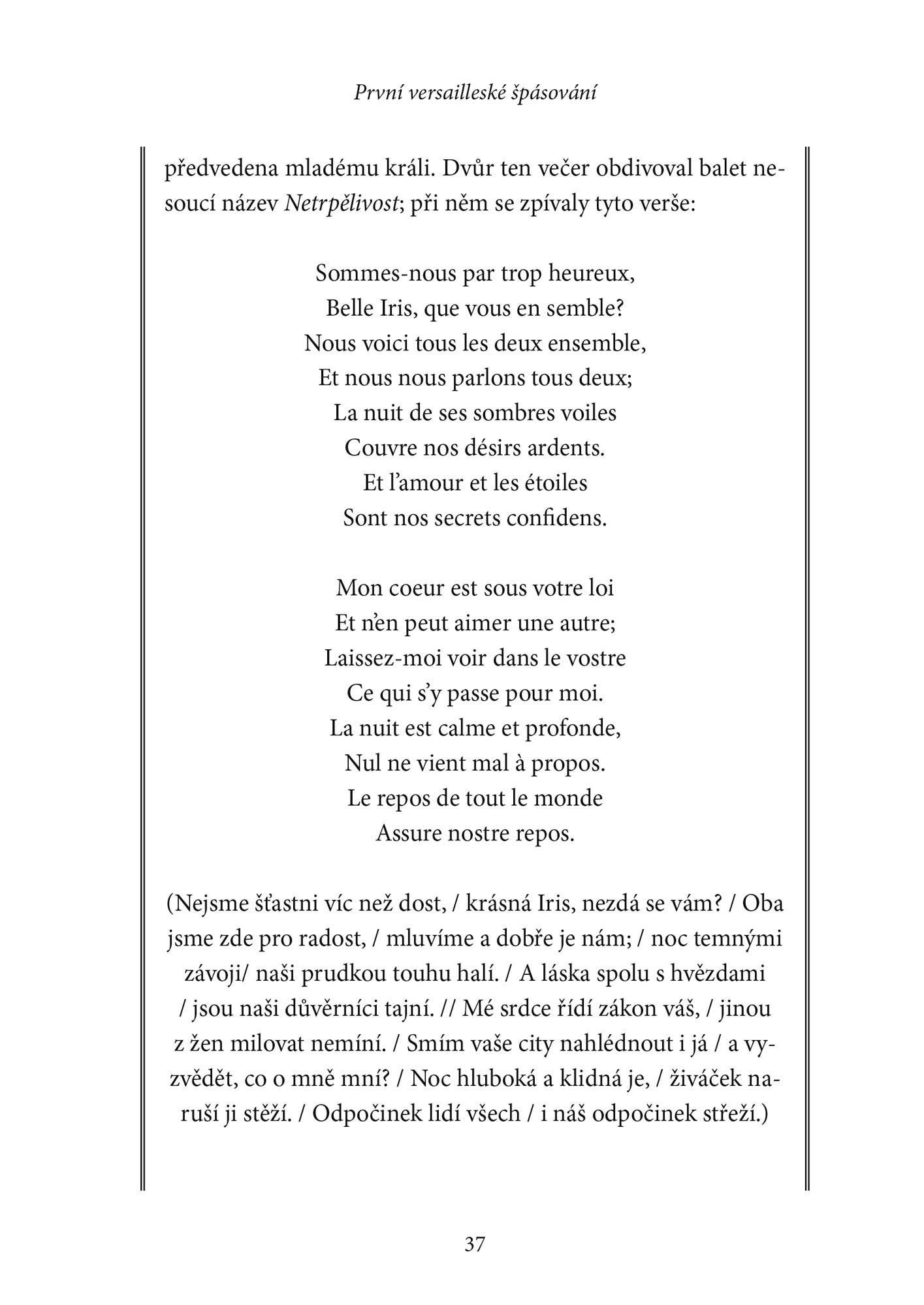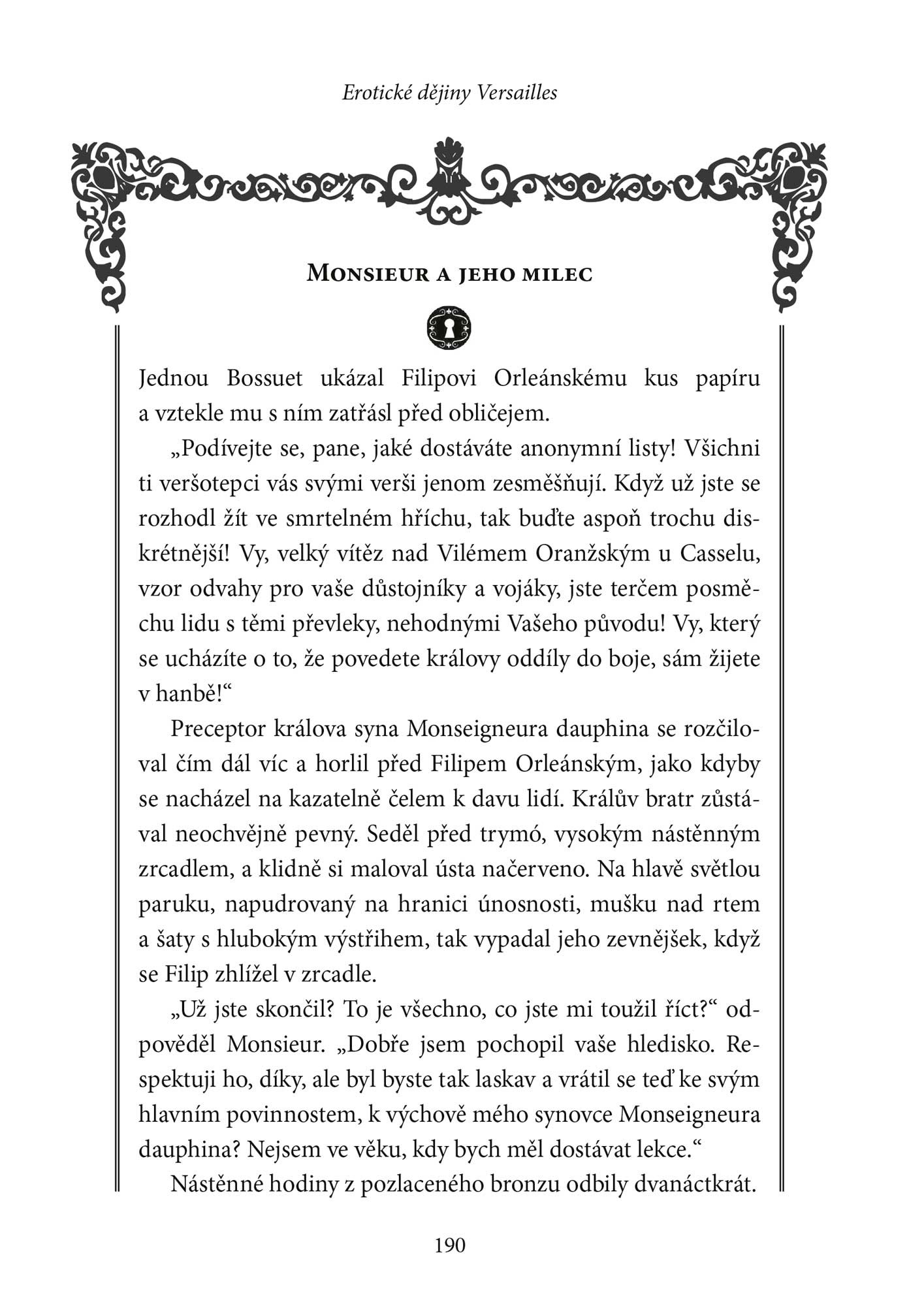 Jsou Versailles místem symbolizujícím moc? Ano, ale také místem rozkoše, touhy a hýření. Ze skromného loveckého pavilonu po svém otci Ludvíku XIII. si Ludvík XIV. zbudoval mládenecký příbytek, aby se měl kam uchýlit se svými prvními láskami, jako byla Louise de La Valli?re. Později si přes zásadní nesouhlas svého ministra financí Colberta prosadil, že si tam zařídí nevěstinec svých mladých let. A tak se tam v rozverném víru střídaly milenky a jeho oblíbenkyně, počínaje paní de Montespan a konče paní de Maintenon, ale i ženy, s nimiž král zažíval chvilkové milostné povyražení na jediný večer. Laškovalo se tam se zanícením v alkovnách komnat s výzdobou, o niž se postaral malíř Le Brun, nebo za křovinami a keři zahrad, o něž se zasloužil věhlasný královský zahradník Le Nôtre.