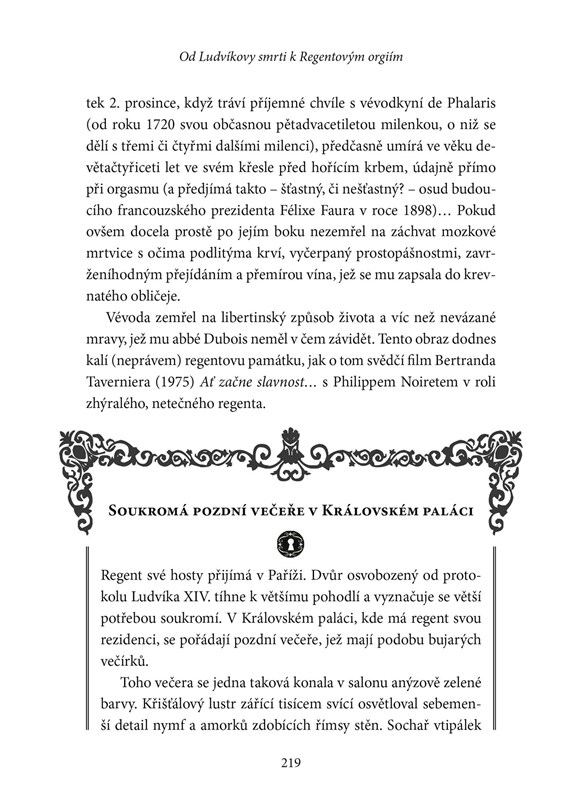 Po milcích Filipa I. Orleánského a orgiích jeho syna Filipa II. Orleánského z doby, kdy jako regent vládl za Ludvíka XV., soupeří o čest posloužit neukojitelné žádostivosti Ludvíka XV. slečny z Parc-aux-cerfs, jež pro krále vybírala jeho oficiální „favoritka“ paní de Pompadour. V předvečer Velké francouzské revoluce se za unaveného Ludvíka XVI., posměšně řečeného Měkký, který se dře, aby uspokojil Marii Antoinettu, tato „malá Sodoma“ s uvolněnými mravy vybouří naposledy.