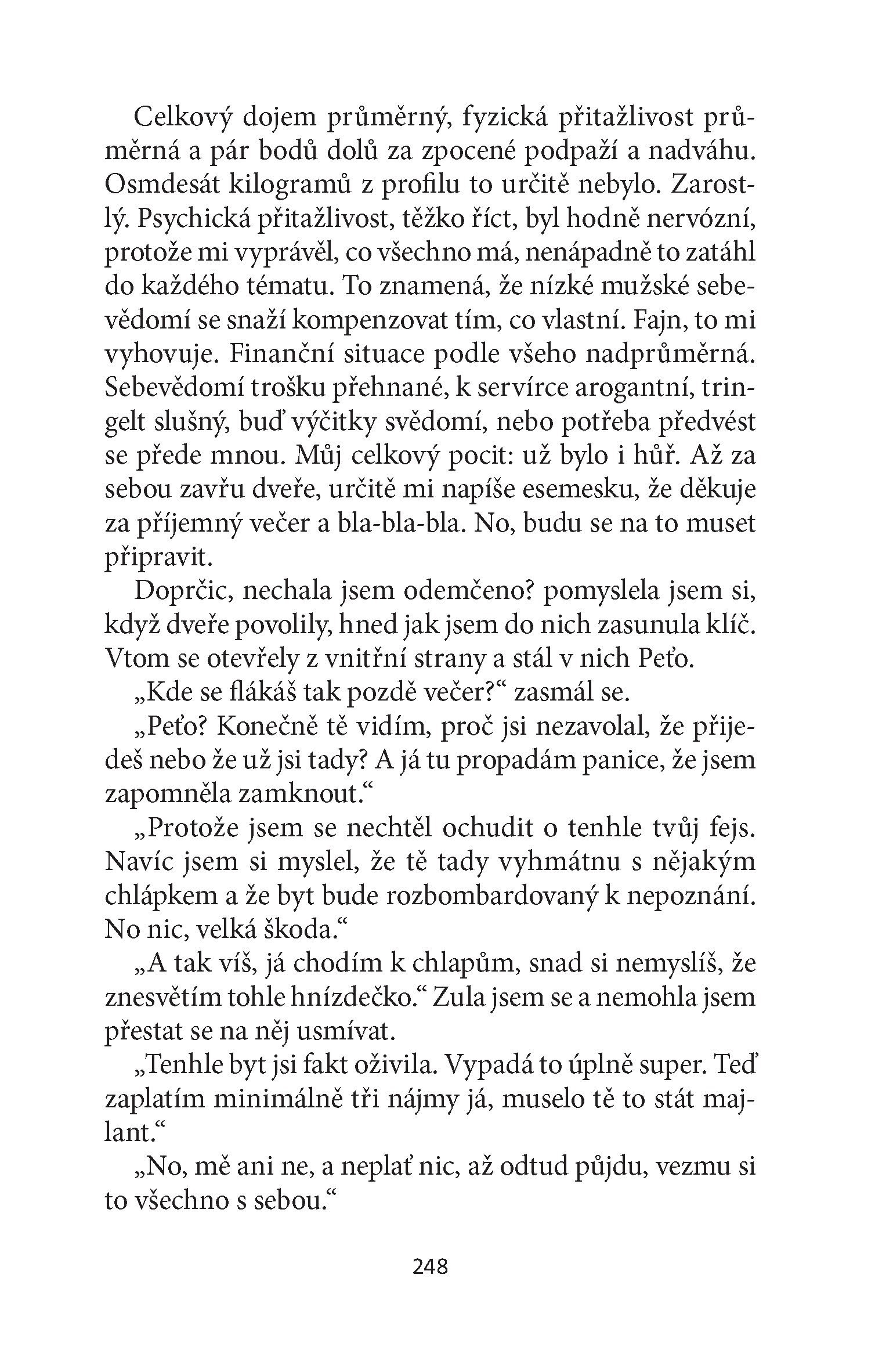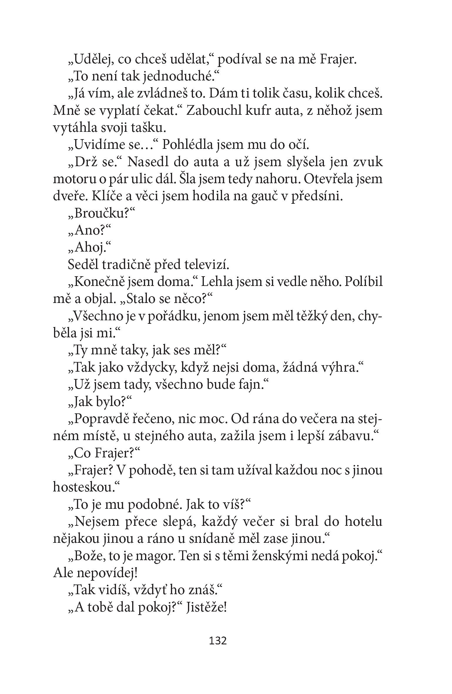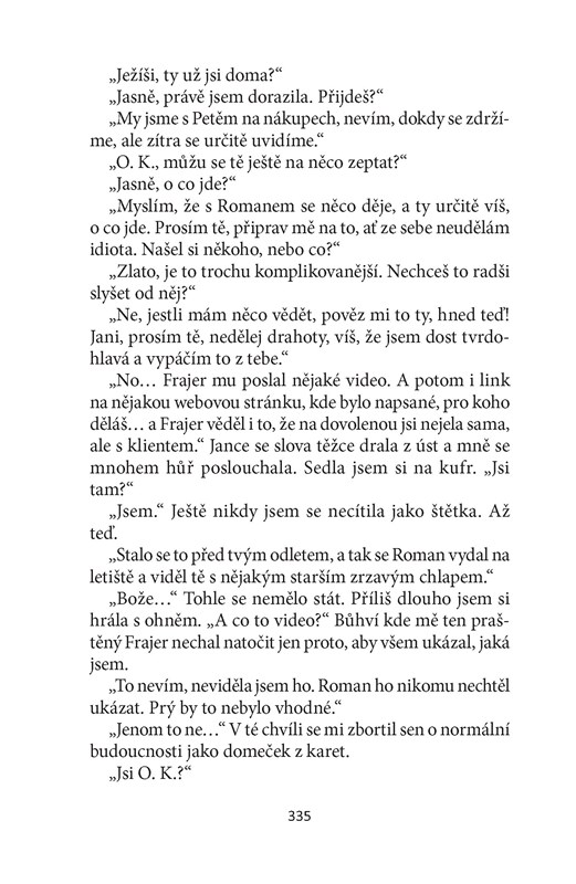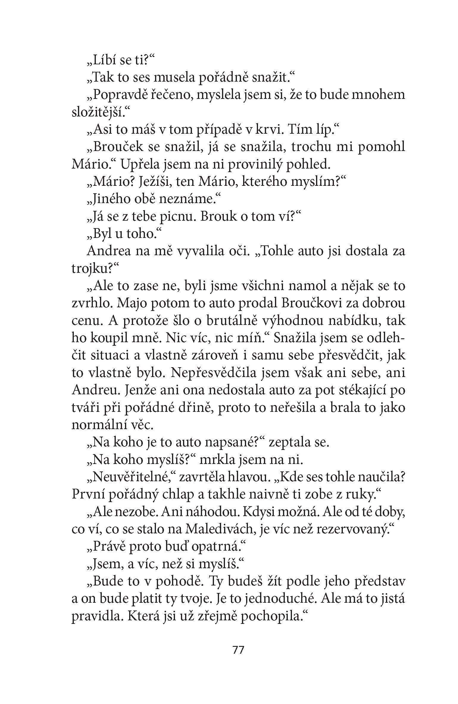 Skutečně se jí to podaří. Svého o hlavu menšího partnera s pleší a bříškem nazývá Broučkem. On jí za to koupí "trojky" a svěří svoji kreditku. Musí však něco obětovat a není toho zrovna málo. S rodiči se téměř nestýká, na jiného muže se nesmí skoro ani podívat, o skutečné lásce si musí nechat jenom zdát a hlavně musí dbát na to, aby se pořád líbila, protože jinak by se mohla ze dne na den ocitnout na ulici.