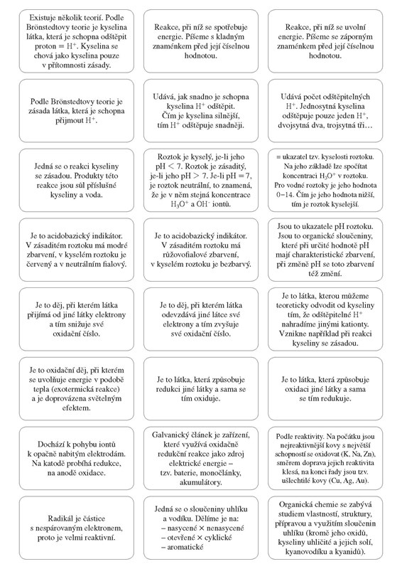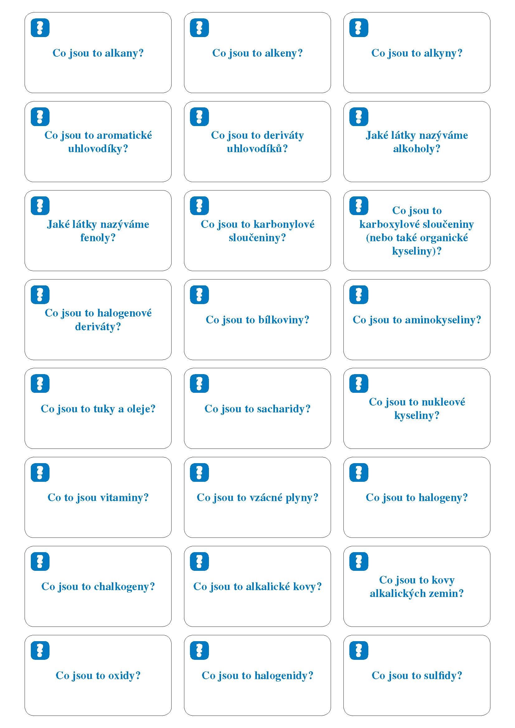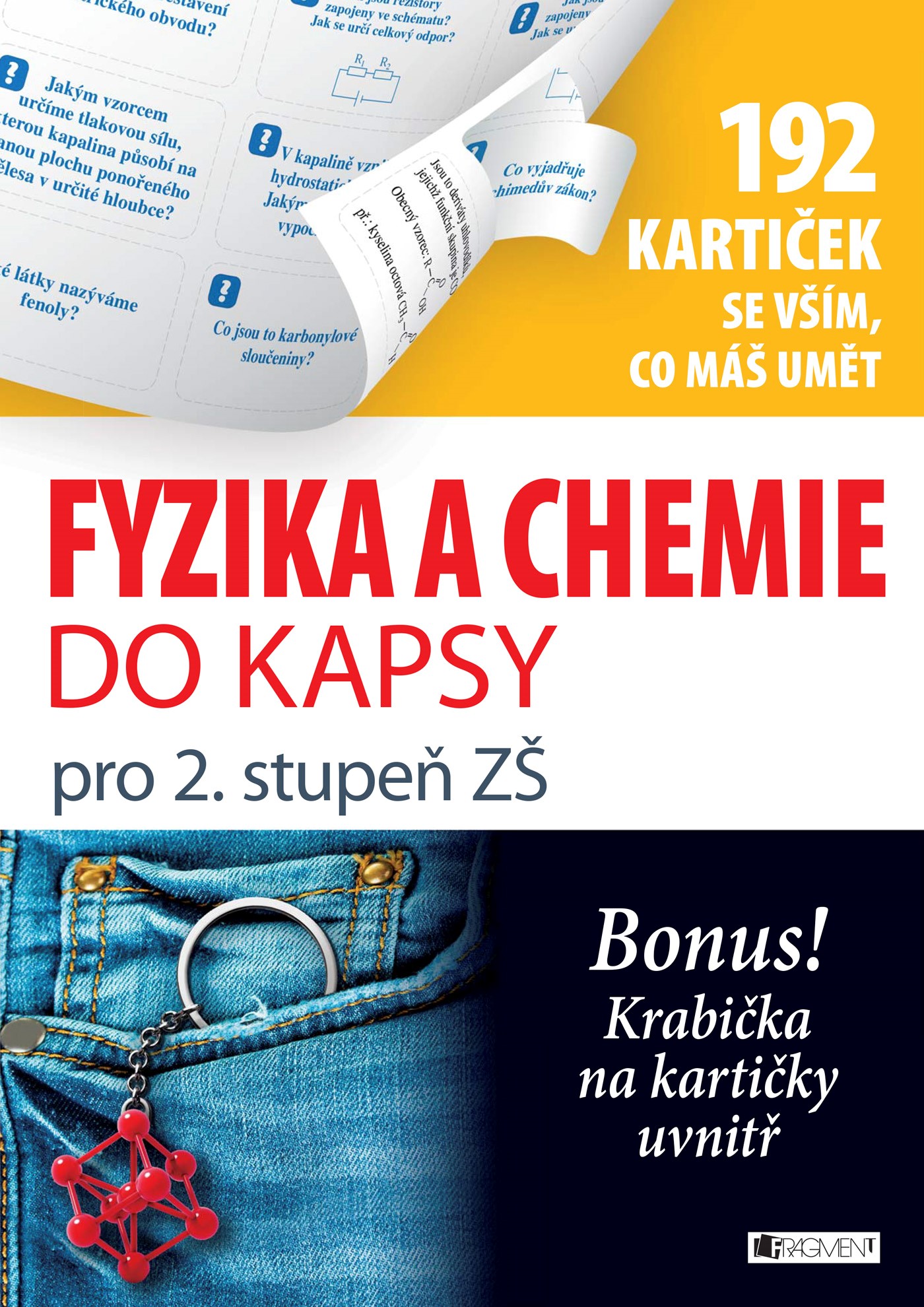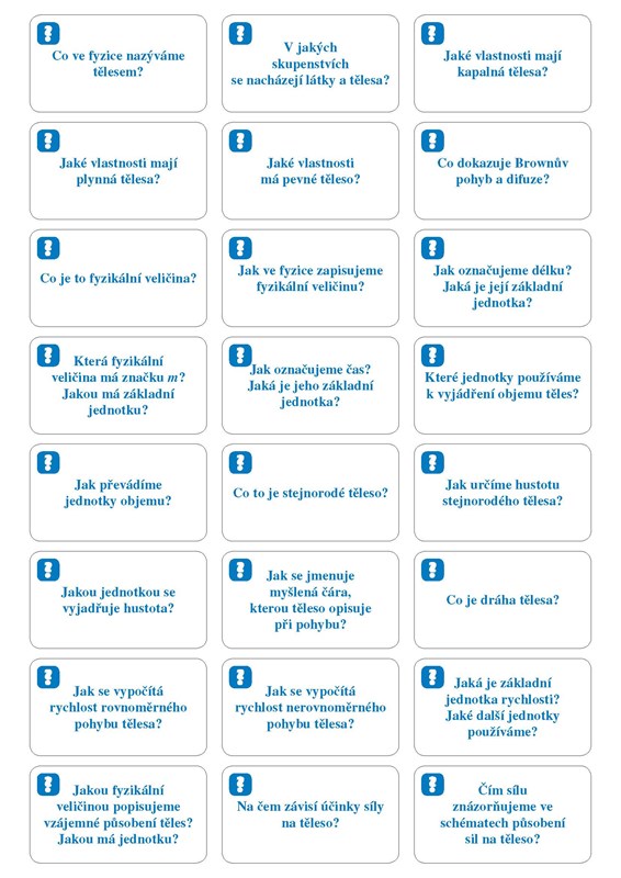 192 kartiček se základním učivem z fyziky a chemie můžeš mít stále u sebe. První polovina kartiček je z fyziky, druhá z chemie. Na jedné straně kartičky je otázka, na druhé správná odpověď. Sestav si vlastní sadu a procvičuj témata, která právě probíráte ve škole.