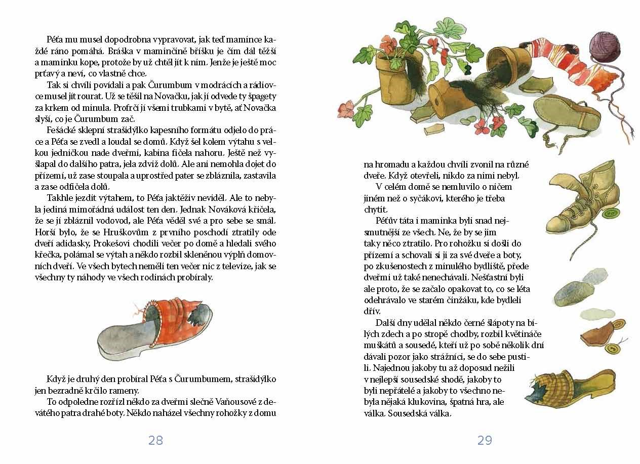 Představte si sídliště, uprostřed něj vysokánský dům a v něm docela nahoře malého Péťu. Teprve se přistěhoval a z té výšky mu jde hlava kolem. A vnitřek takového domu je jeden velký lunapark! Zvlášť když Péťa ve sklepě objeví podivné stvoření. Je to fešácké strašidlo Čurumbum, a když se spolu ti dva seznámí, Péťa ještě ani netuší, jak důležitého si našel kamaráda. Kdo by mu jinak pomohl zneškodnit toho synka, který řádí po domě a vyvádí jednu neplechu za druhou? Ještě aby ty průšvihy padly na Péťovu hlavu, to tak!