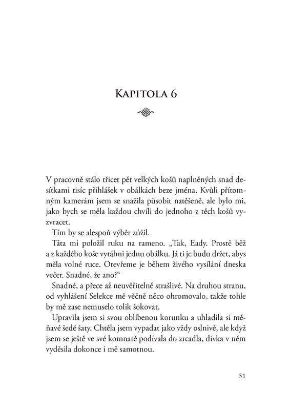 Princezna Eadlyn od malička stále dokola poslouchala vyprávění o tom, jak se potkali její rodiče. Ona ovšem ani náhodou netouží opakovat jejich romantický příběh! O svém životě však nerozhoduje sama. Její protesty jsou naprosto zbytečné, i ona si musí manžela vybrat v Selekci.