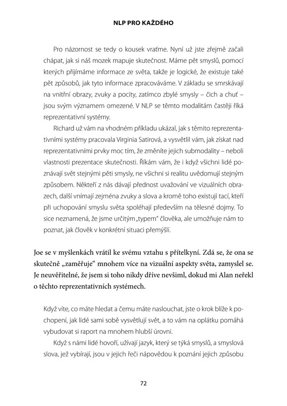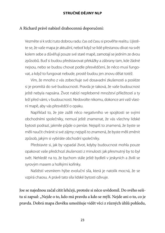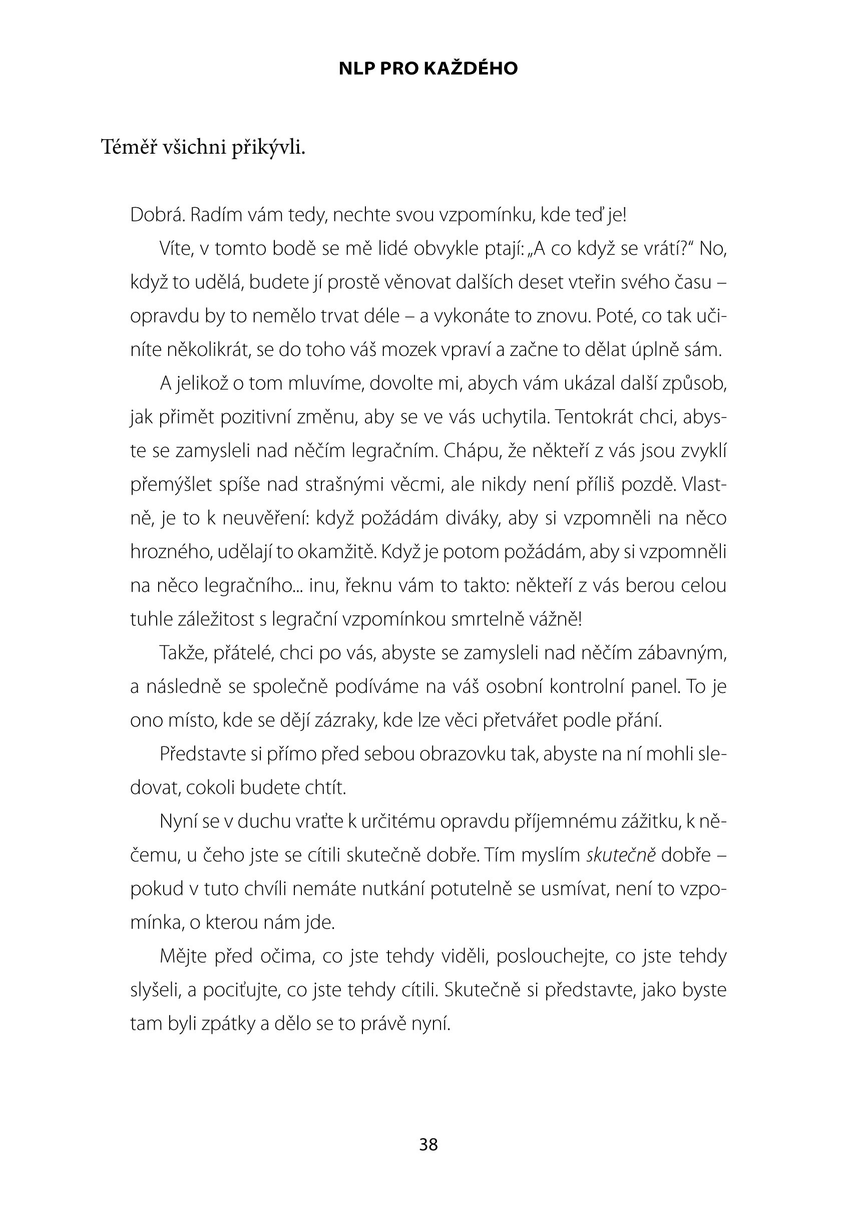Chcete probudit skutečný potenciál a změnit svůj život? Tato publikace vám pomocí jednoduchého příběhu ukáže, jak fungují metody neurolingvistického programování a jak je používat. Při čtení knihy se můžete i vy stát jedním z účastníků kurzu Dr. Bandlera. Přečtěte si, co účastníci takového kurzu poslouchají, nahlédněte mezi ně, prožijte si to, co oni zažívají, a naučte se, čemu se učí i oni! Kniha vám poskytne mocné nástroje, díky nimž se zbavíte fobií, depresí, špatných návyků či psychosomatických onemocnění. Buďte raději silní, šťastní a úspěšní!