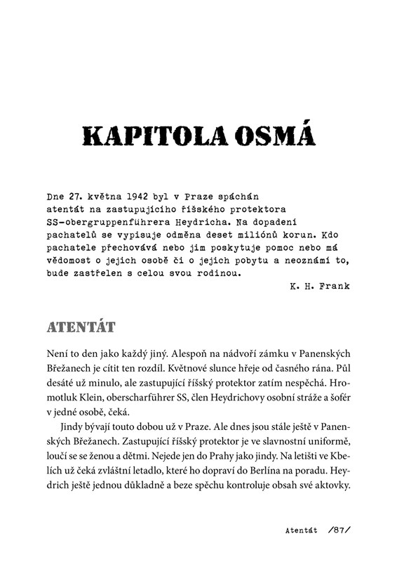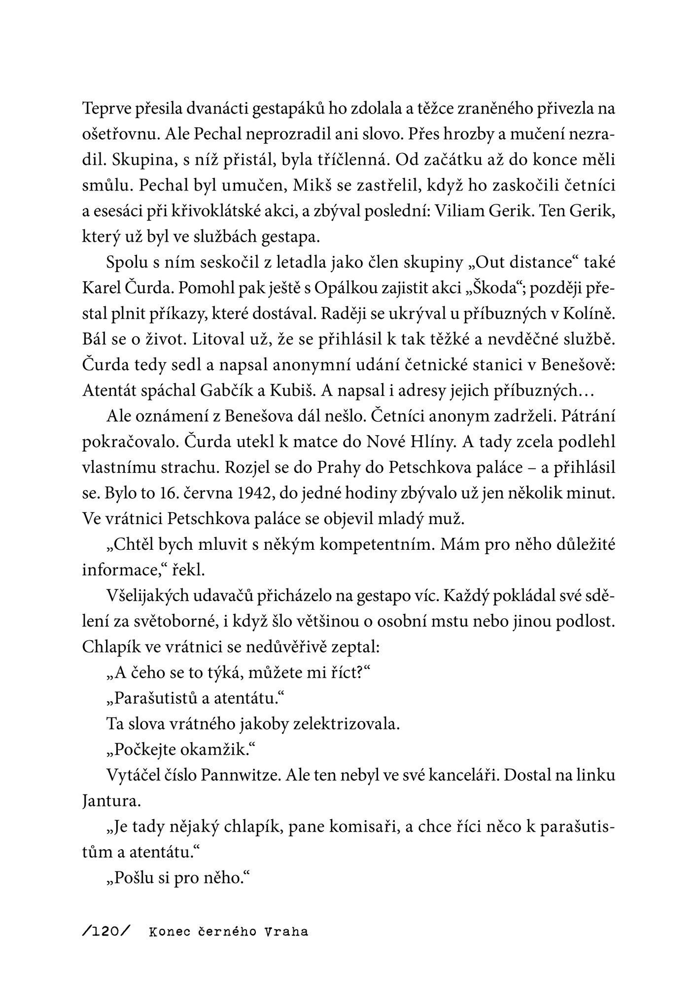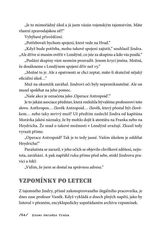 Kniha Konec černého vraha odhaluje dramatický příběh o tom, jak celá tato operace probíhala i kdo byli jeho jednotliví aktéři. Od jmenování Heydricha do funkce v Protektorátu až do posledních bojů v kryptě pravoslavného chrámu sv. Cyrila a Metoděje. Přináší dobové citáty, detaily vyšetřování, osobní příběhy plné odvahy, ale i zrady v jednom z nejdramatičtějších momentů naší historie.