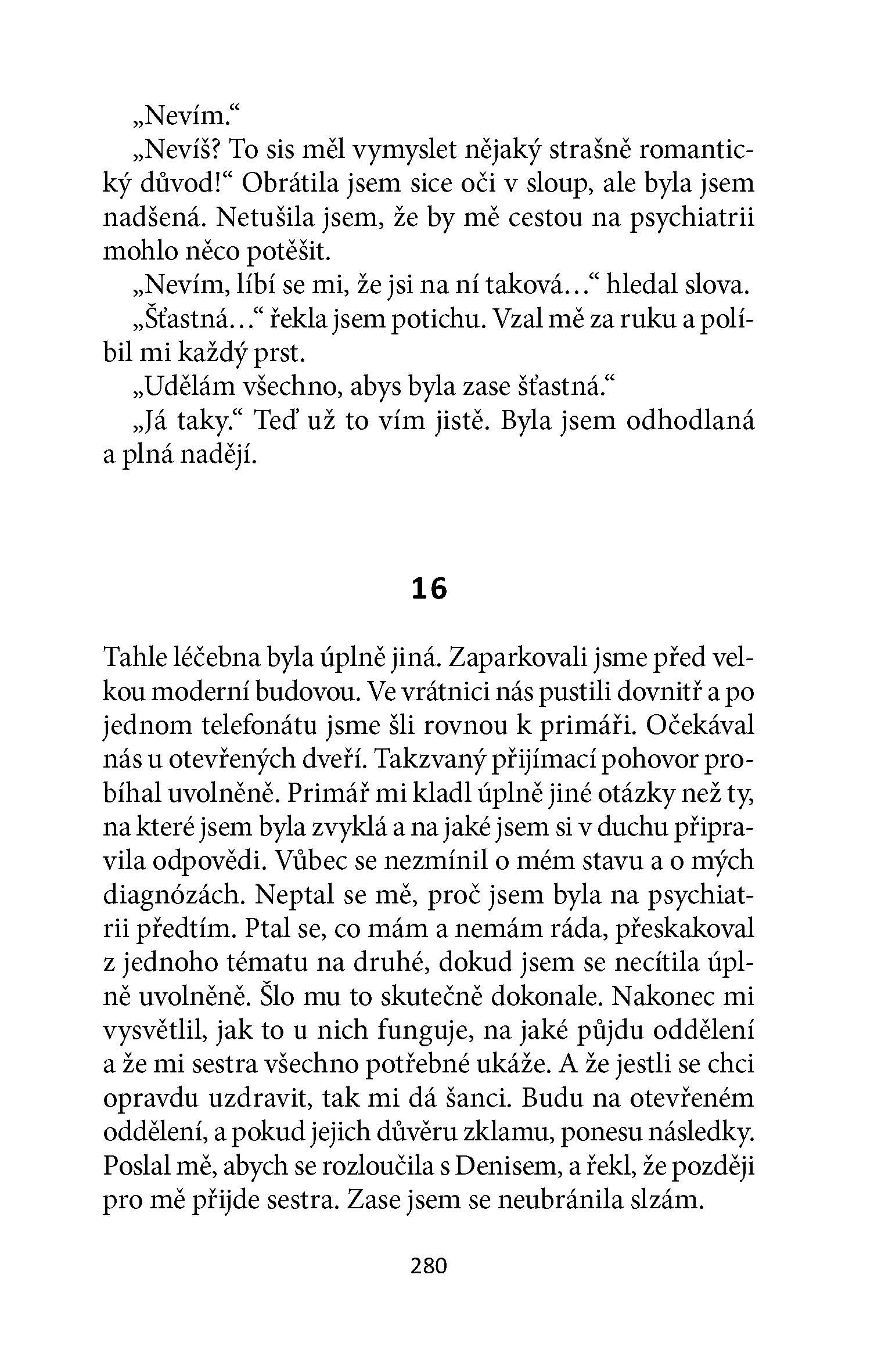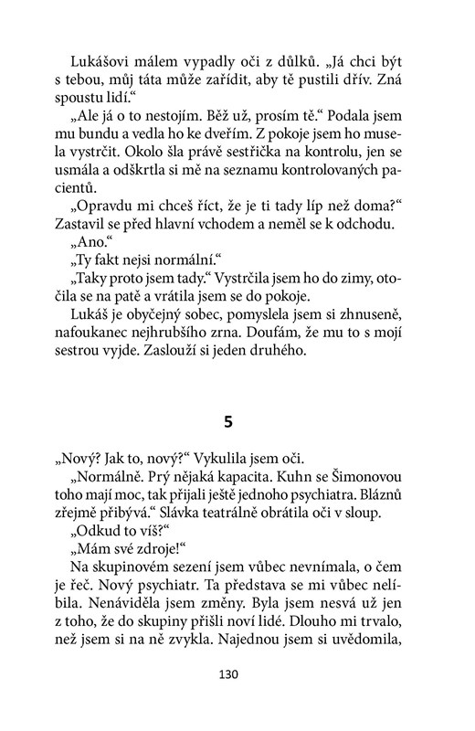 Hlavní hrdinka románu Lucie Saskové, autorky bestselleru Zlatokopka, chce jediné: být normální. Mít normální vztah, někoho milovat, být šťastná. Věci se ale nevyvíjejí tak, jak si představovala. Po smrti svého přítele se ocitá v psychiatrické léčebně a její svět se obrací vzhůru nohama. Najednou je pro ni těžké normálně fungovat, vyznat se ve vlastních vzpomínkách, stát si za svými činy. Je to, co si pamatuje, pravda, nebo bylo všechno jinak? A bude mít ještě šanci začít znovu a vybudovat si vysněný život s mužem, který jí jako jediný rozumí? Vše se zdá být nejisté a ohrožené; je totiž nebezpečná. Pro sebe i pro své okolí.