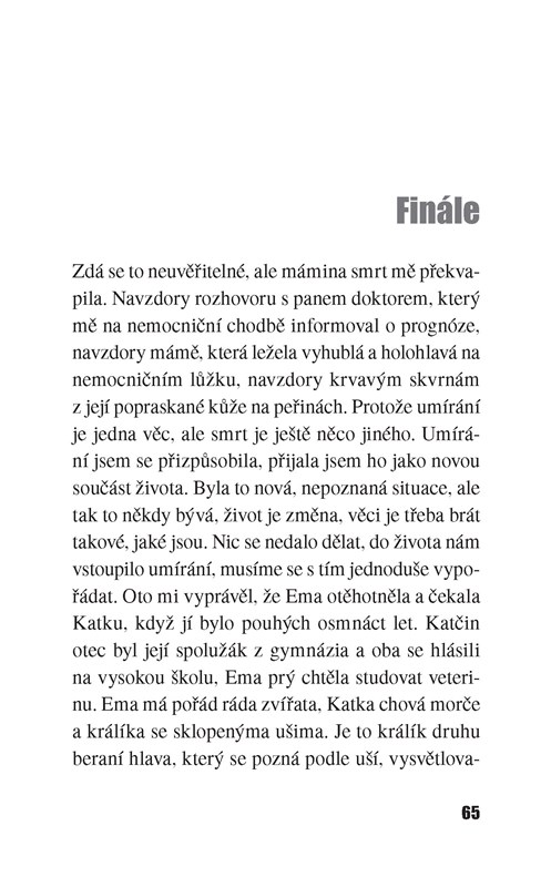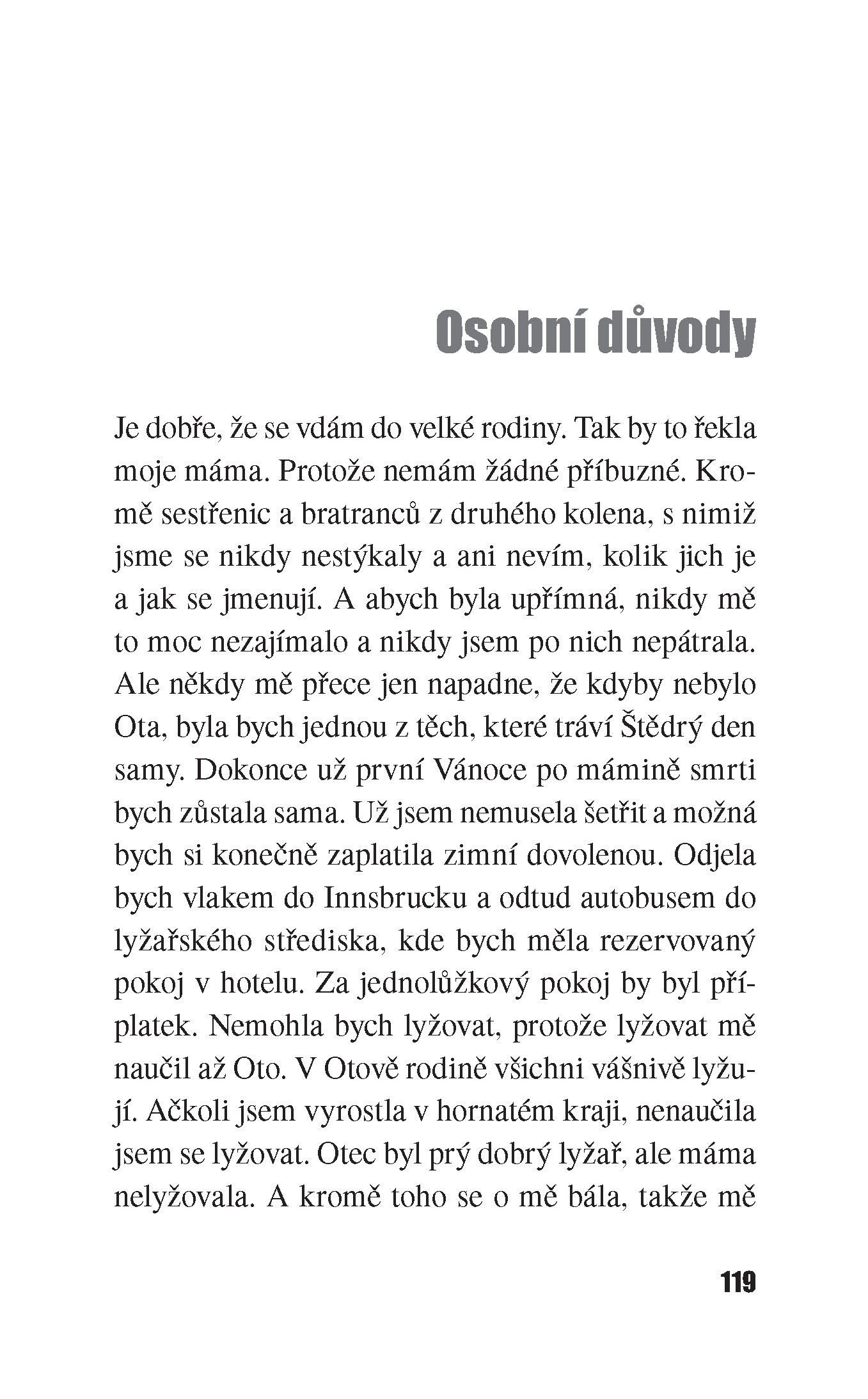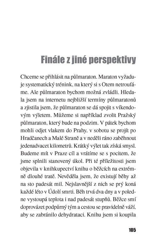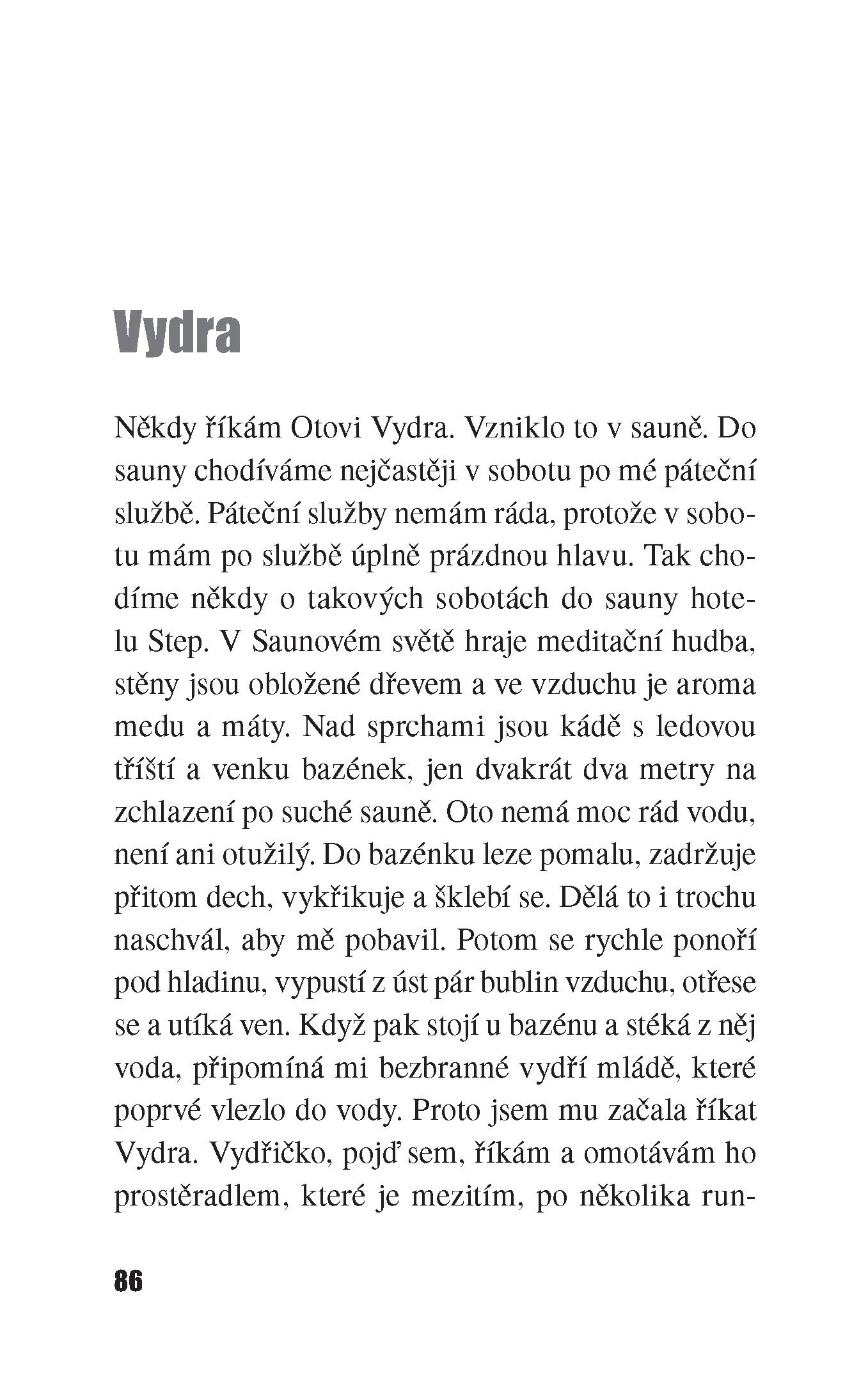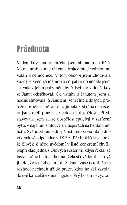 Teď se snažíme všechno stihnout do setmění, protože si cením večerů, kdy si smím po setmění lehnout. Někdy ležím a nechci spát, abych si vychutnala večer a noc. V mé mysli se večer mění v noc v deset. Většinou se snažím bdít, ale usnu a noc zmeškám. Oto si jde lehnout mnohem později. Někdy se vzbudím, když vyjde z koupelny a obléká se u postele. Podívám se na mobil, který si na noc nechávám na nočním stolku, a vidím, že jsou dvě hodiny ráno. Někdy mám chuť vstát a tvářit se, že už je den. Ale naučila jsem se vážit si spánku a většinou hned zase usnu.