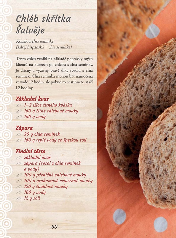 Myslíte si, že upéct si vlastní chleba je příliš těžké? Autorka této knihy vás přesvědčí, že ne. Skoro denně peče poctivé domácí kváskové klasické i bezlepkové pečivo. Zvládá to s láskou, radostí a s přehledem i bez vymožeností dnešní doby – bez strojů a kuchyňských robotů. Používá klasické pomůcky – lopaty na sázení chleba do pece i pedigové ošatky. Mouky různých druhů – žitnou, pšeničnou, špaldovou, grahamovou. Semínka do zápary i do těsta. Toto umění předá i vám.