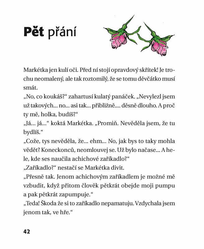 Jednoho dne se Markétce splní sen -- dostane nový domov. Doposud žila v dětském domově a teď má konečně rodiče, staršího bratra i babičku. Co chtít víc? Ale v babiččině krásné zahradě je stará pumpa. Když jednou holčička zapumpuje a bezděky vysloví ta správná slova, objeví se kulaťoučký skřítek. A ten jí nabídne splnění pěti přání. Co si jen asi bude Markétka přát?