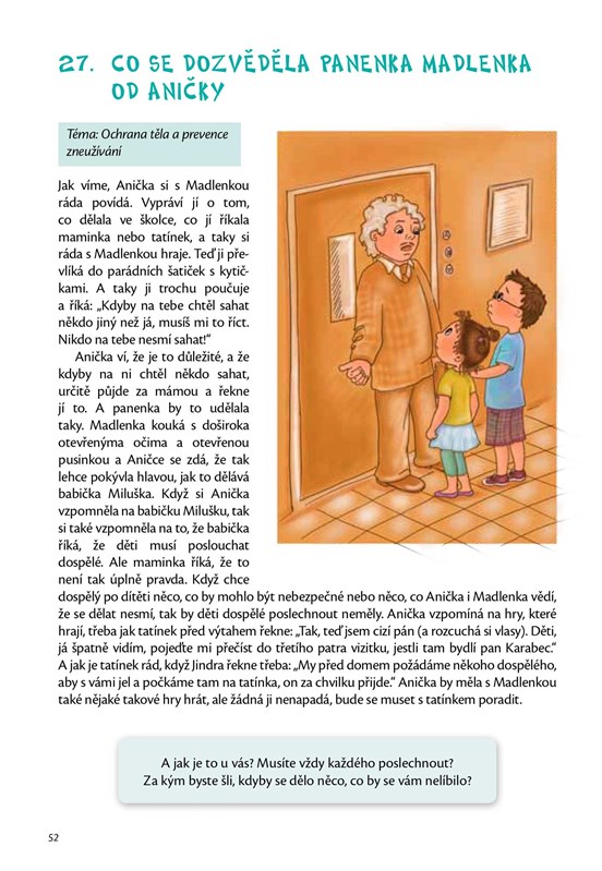 Kniha profesionálních autorek s dlouholetou praxí je rozdělena do dvou částí. První je určena přímo dětem. Prostřednictvím příběhů rodiny Mrákotových a zážitků skoro pětileté Aničky a jejího sedmiletého brášky Jindry se dozví mnohé o lidském těle, o správné hygieně, o tom, jak přicházejí děti na svět i jak se chránit před nebezpečím. Laskavé vyprávění s krásnými barevnými ilustracemi jim pomůže zcela přirozeně pochopit to, co vědět mají a o čem se s nimi někdy dospělí bojí mluvit.