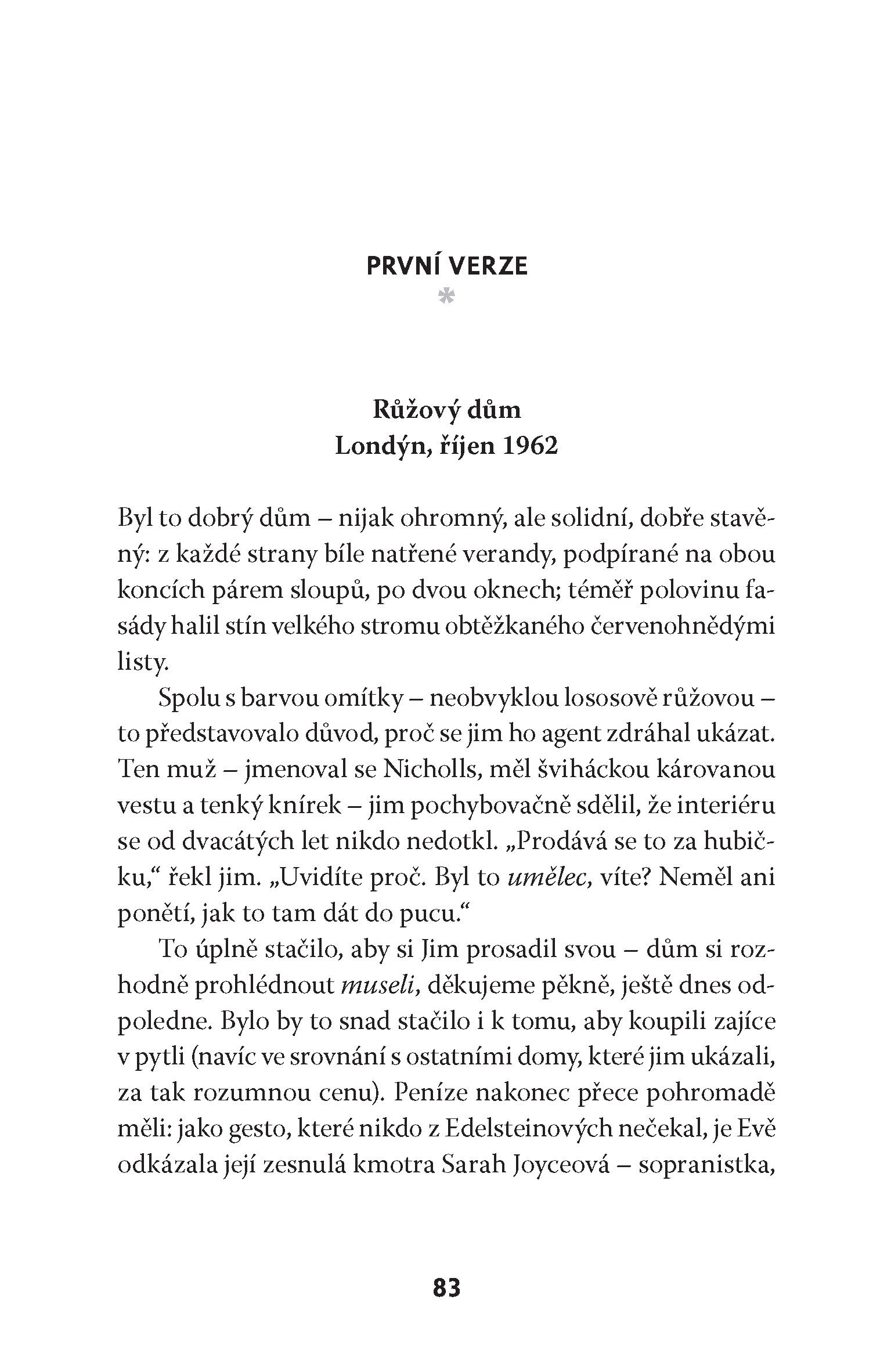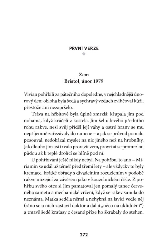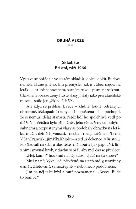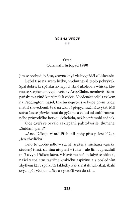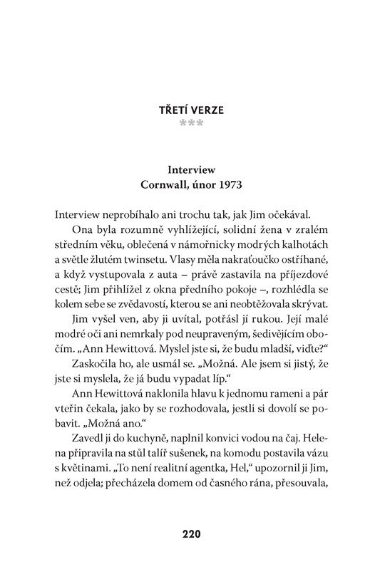 Žena na obraze měla vlasy tmavě hnědé, s kaštanovým leskem. Odvracela se, dívala se na muže, který seděl za ní na pohovce v obývacím pokoji; díval se na ni a zároveň i na diváka s výrazem, který měl být podle Jima nečitelný. V tu chvíli měl největší starost o toho muže – který byl a nebyl on sám, stejně jako tou ženou byla Helena i Eva Katzová a všechny ženy, které kdy potkal –, muže, který vypadal příliš nešťastně. Měla to být třetí část triptychu. Ostatní dvě už byly zabalené a stály opřené o zeď ateliéru a byly téměř stejné, jen s menšími obměnami. Na prvním z nich seděla žena a muž stál, na druhém seděli oba. Jim změnil také drobné detaily v místnosti, místo, na kterém za pohovkou stály hodiny, pohlednice a foto grafi e na krbové římse, barvu kočky odpočívající na křesle (jen jedna z nich byla černobílá na počest Marcela). „Něco jako hledej pět rozdílů,“ poznamenala Helena, když jí poprvé vysvětlil svůj nápad. Samozřejmě žertovala, ale on dobře cítil i ten osten. Jeho ambice s triptychem byly mnohem větší. Obraz měl znázorňovat všechny cesty, které zůstaly nevyužité, mnohé životy, které nebyly žity, životy, které nikdo ne žil. Nazval ho: A co kdyby to bylo jinak?