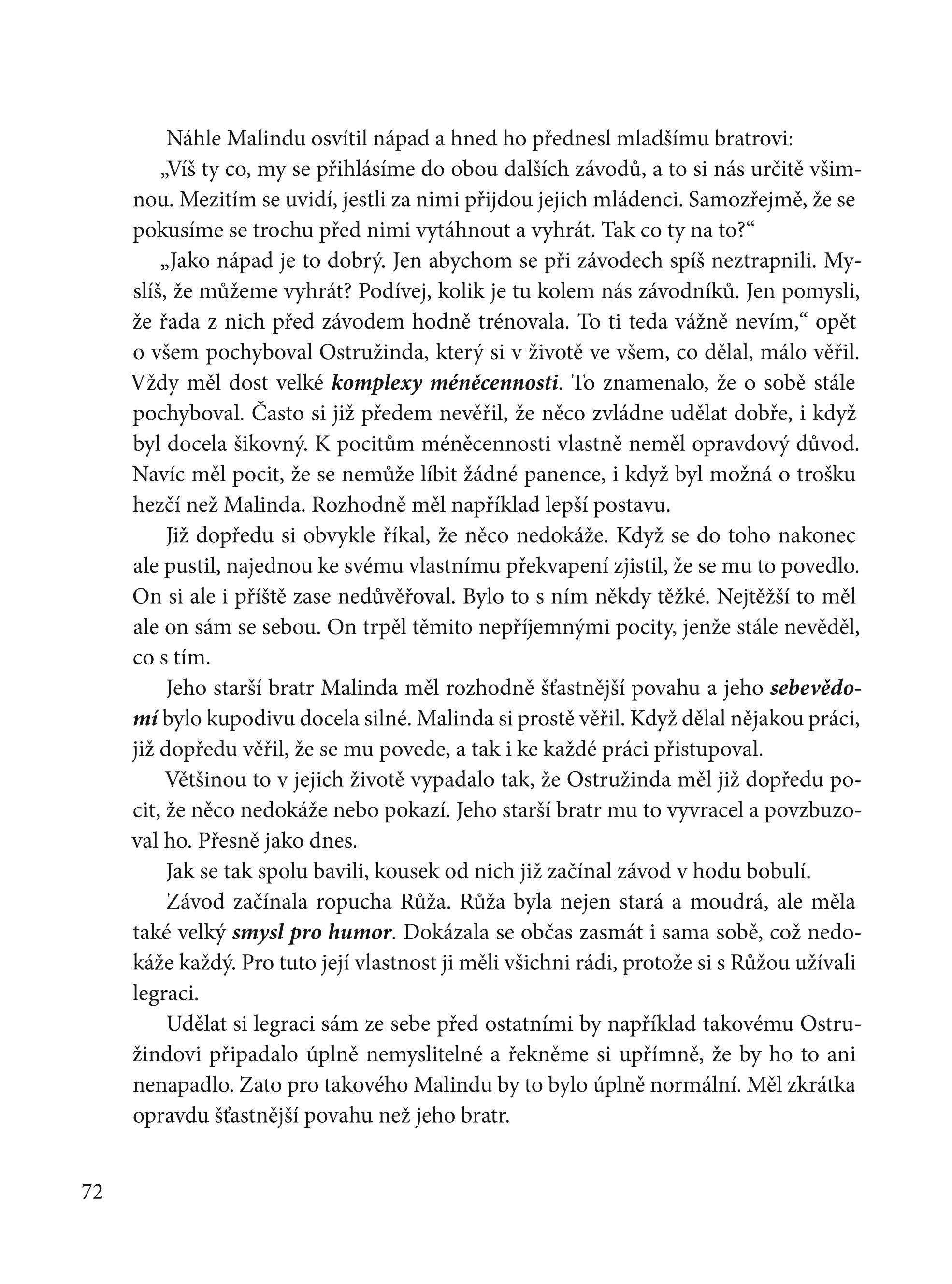 Méně známá slova a slovní spojení jsou v knížce vyznačena tučně a hned na příkladu nenásilnou formou dětem vysvětlena. Dozví se tak například, kdo je to egoista, co jsou mimikry, sebevědomí a komplexy méněcennosti, šikana, fér a nefér chování, imunita, sportovní a hudební talent či antitalent a jiné.