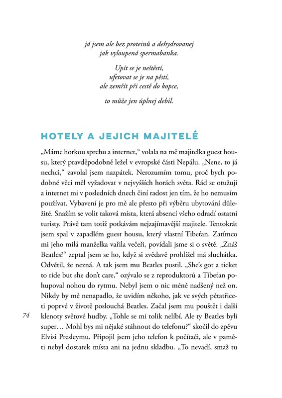 Takové je motto prince Ládíka, který se tentokrát vydal zdolat Himálaj a probádat údolí čínských a nepálských řek. Ať už excentrický poutník zrovna trpí výškovou nemocí, zachraňuje lidský život, nebo je zatýkán čínskou policií, vše komentuje s humorem. Ziburův příběh je svědectvím o lehkosti a nadhledu, s nimiž jde ke světu přistupovat. Chodí pěšky, spí u cizích lidí doma a vloni o tom napsal svou první knihu, která se náhodou stala bestsellerem. Teď se nechal přemluvit, ať napíše i druhou.