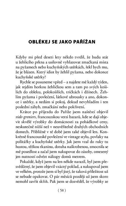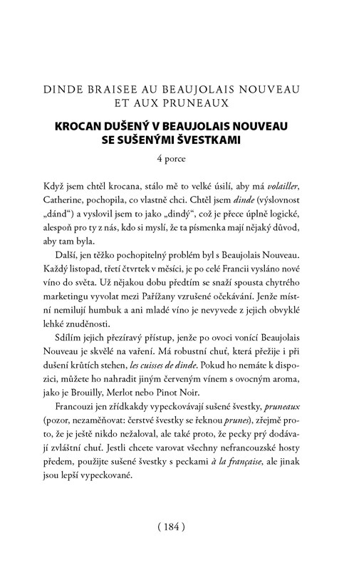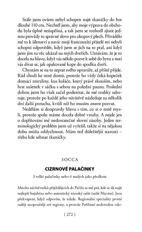 David s vtipem a nadhledem vypráví o svých zážitcích v tomto úchvatném, občas šíleném městě, o tom, jak se do Paříže zamiloval a jak se jí pokoušel porozumět. Jeho zábavné historky jsou prokládány autentickými recepty na sladké i slané pochutiny, jako jsou vepřová pečeně s glazurou z hnědého cukru a bourbonu, krocan dušený v Beaujolais Nouveau se sušenými švestkami, koláč se slaninou a sýrem s modrou plísní, čokoládovo-kokosové marshmallows, čokoládové dortíky s mandlemi nebo madlenky s citronovou polevou.