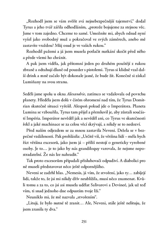 Vypadá jako člověk, ale není člověk. Je nemilosrdná, je neporazitelná, je oddaná. Jmenuje se Nemesis a je diabolik. Bytost, jejíž existence má jediný smysl: zabíjet či zemřít pro tu, jejíž život má ochraňovat: Sidonii – dceru galaktického senátora…