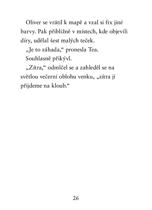 Oliver – detektiv, kterému to zatraceně pálí. Vidí to, co ostatní ne. K přemýšlení potřebuje plný žaludek – a mozek. Jeho teoretické znalosti a vynalézavost skvěle vyvažují Teinu dobrodružnou povahu.