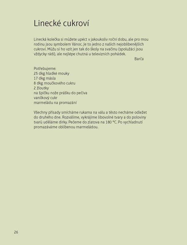 Netradiční vánoční kuchařku pro děti napsala Jana Voldřichová společně s dětským výtvarným kroužkem Výtvarka v kuchyni. Všechny recepty, které zde najdete, jsou doslova lahodou pro oko. Děti při jejich tvoření použily různé výtvarné techniky: olej, linoryt, vyšívání, koláž a jiné. Každý recept má svůj příběh a nese podpis malé autorky či autora. Inspirujte se a začněte s láskou péct a malovat.