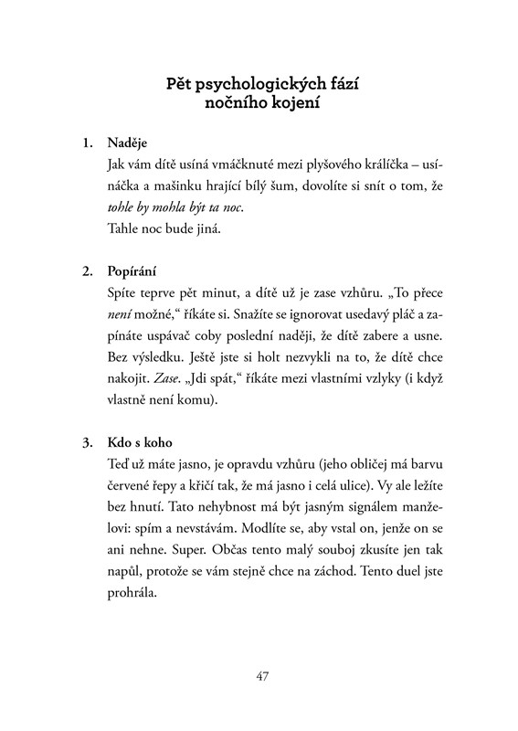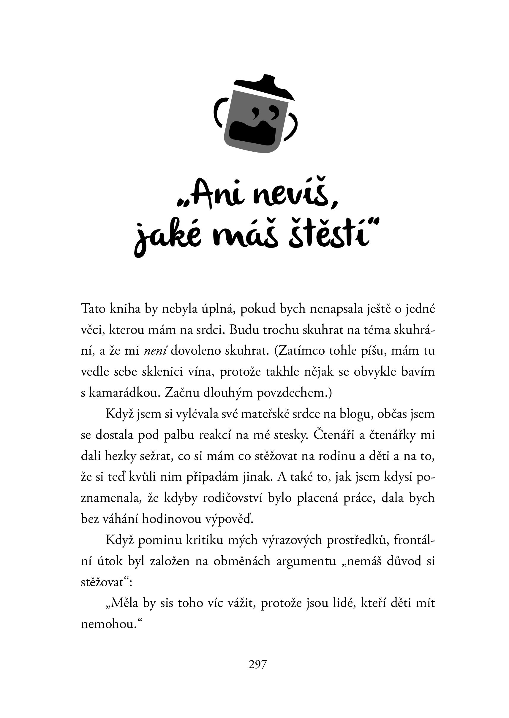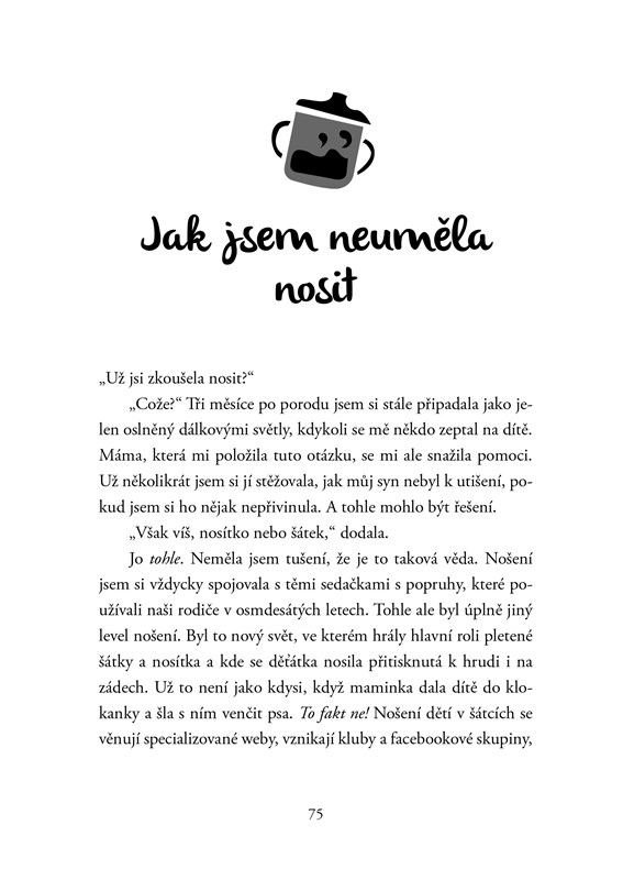 V této knize se nedočtete, jak máte vychovávat děti, co jim kupovat nebo jak se máte cítit. Díky její osvěžující upřímnosti se zasmějete, možná si popláčete, ale hlavně si oddechnete, že v tom všem skutečně nejste sama.