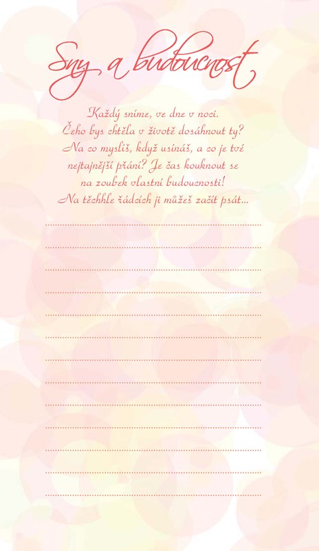 Můžeš se i zasnít a vybrat si, co z tebe jednou bude! Staneš se hvězdou, přijde ti dopis z Bradavic nebo potkáš prince? Všechno stojí za to zapsat si na svůj seznam! Jednou budeš touhle knížkou fakt moc ráda listovat, tomu věř ;)