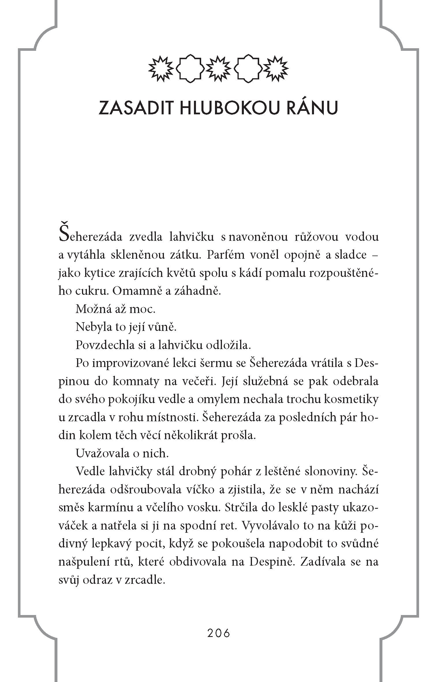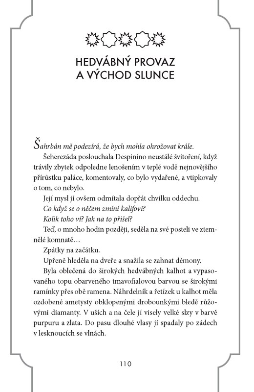 V tomto napínavém převyprávění Tisíce a jedné noci okouzluje Šeherezáda noc za nocí kalifa svými příběhy, a získává tak další dny života. Ale jestli je Chálid doopravdy takové monstrum, jak je potom možné, že se do něj Šeherezáda zamiluje? A znamená v tomto světě plném tajemství láska vůbec něco?