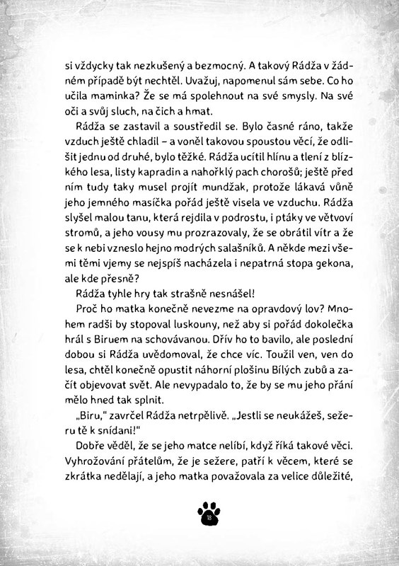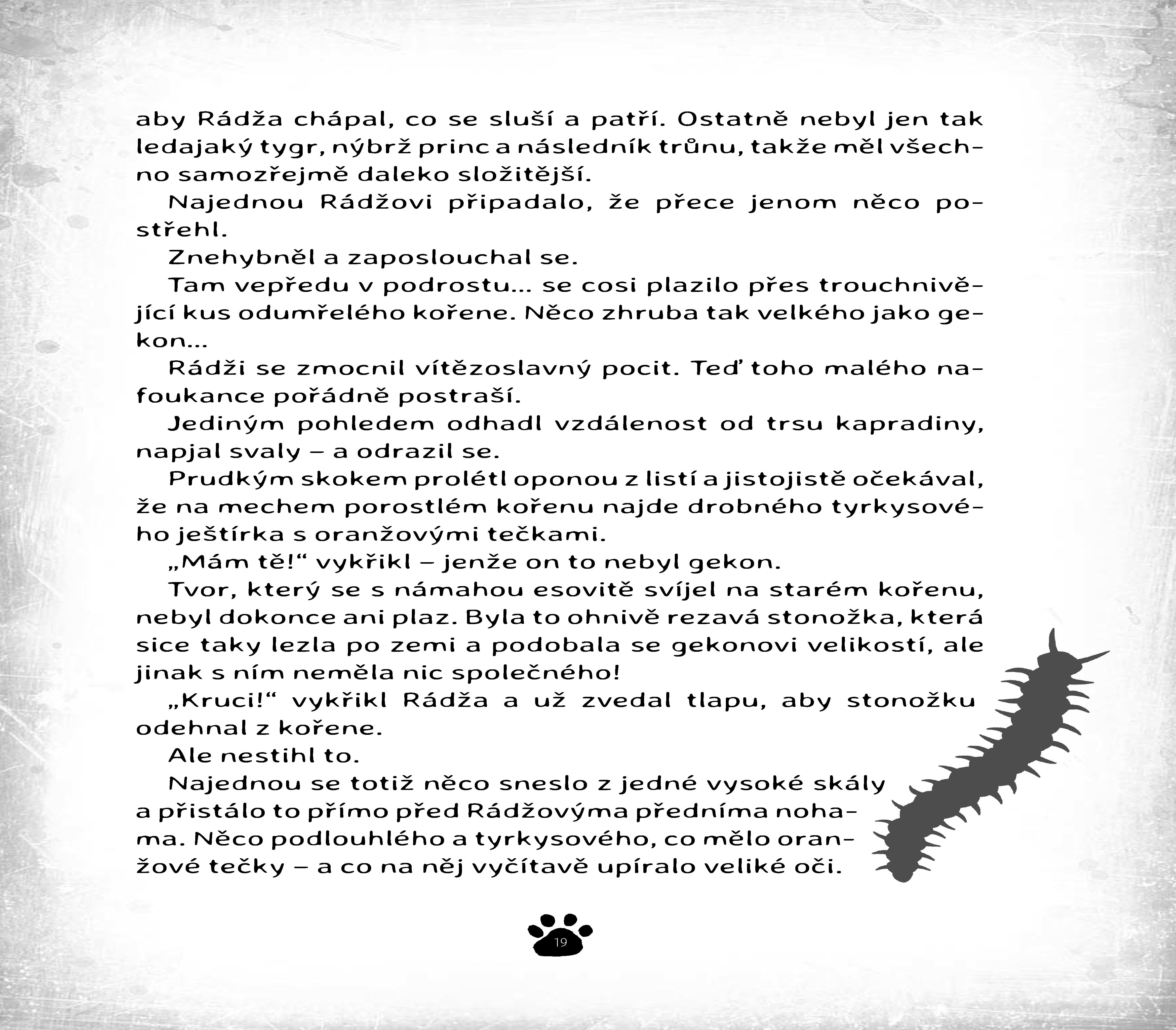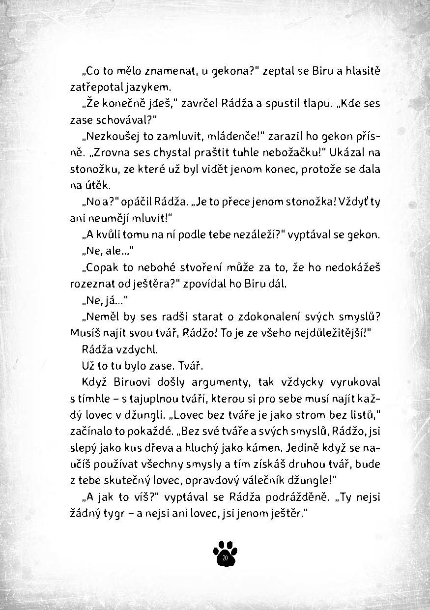 Když Rádžu Železný spár objeví, mladému tygrovi nezbývá nic jiného než prchnout. Se svým věrným společníkem gekonem Biruem se vydávají k ostrovu Stínových válečníků, kde by měla být dokončena jeho přeměna ve velkého lovce. Cesta je ale dlouhá a džungle plná nástrah a nebezpečí…