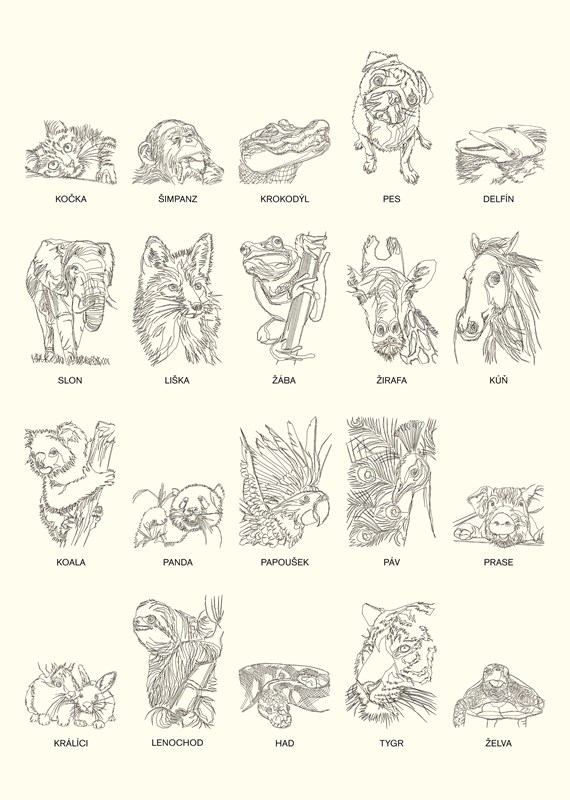 UVNITŘ NALEZNETE OBRAZY TĚCHTO ZVÍŘAT: KOČKA, KŮŇ, KROKODÝL, PES, DELFÍN, SLON, LIŠKA, ŽÁBA, ŽIRAFA, ŠIMPANZ, KOALA, PANDA, PAPOUŠEK, PÁV, PRASE, KRÁLÍCI, LENOCHOD, HAD, TYGR a ŽELVA!
