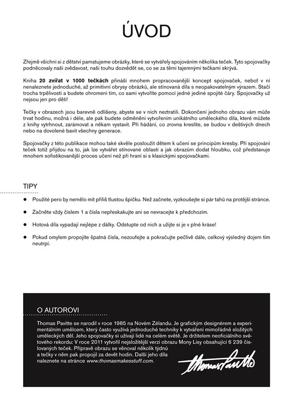 THOMAS PAVITTE je grafický designér z Nového Zélandu, který před nedávnem začal zkoumat možnosti netradičních uměleckých a designérských směrů. Je například autorem nejsložitější spojovačky všech dob obsahující 6239 teček, jejichž propojením lze za nejméně devět hodin pečlivé práce vytvořit obraz Mony Lisy. Je také autorem populární publikace se spojovačkami: 20 portrétů v 1000 tečkách a dalších.