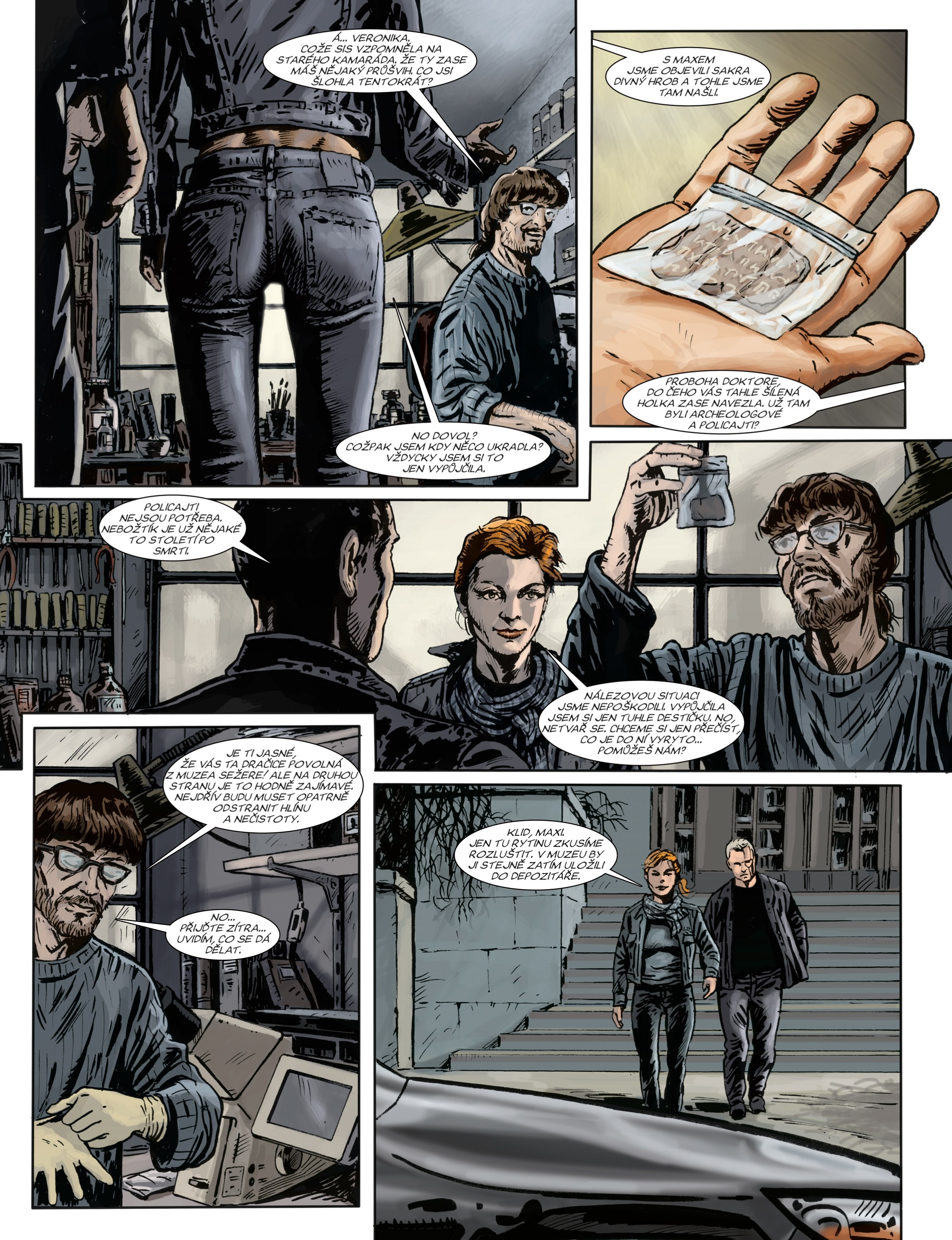 „Jak se dostat jednou mezi legionáře a podruhé třeba do podzemí patologického ústavu? Anebo mezi amatérské archeology? To zažívám se svými spoluautory každou chvíli. Tentokrát se scénáristy Václavem Šorelem a Zdeňkem Šámalem v jejich komiksovém příběhu o tajemství podivné kovové destičky.“