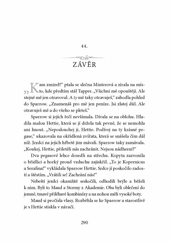 V den jedenáctých narozenin Sparrow konečně propustí ze sirotčince na svobodu. Ale tím její dobrodružství teprve začíná… V doprovodu věrného kocoura Rošťáka se vydává do města zjistit pravdu o svém původu a najít své příbuzné. Město je ale plné nebezpečí… Ztrácejí se v něm nádherní okřídlení koně – pegasové, jejichž slzy lidé považují za zázračný lék… A na sirotky v něm nikdo nečeká… Jemně mrazivá fantasy v duchu Dickensova Olivera Twista.