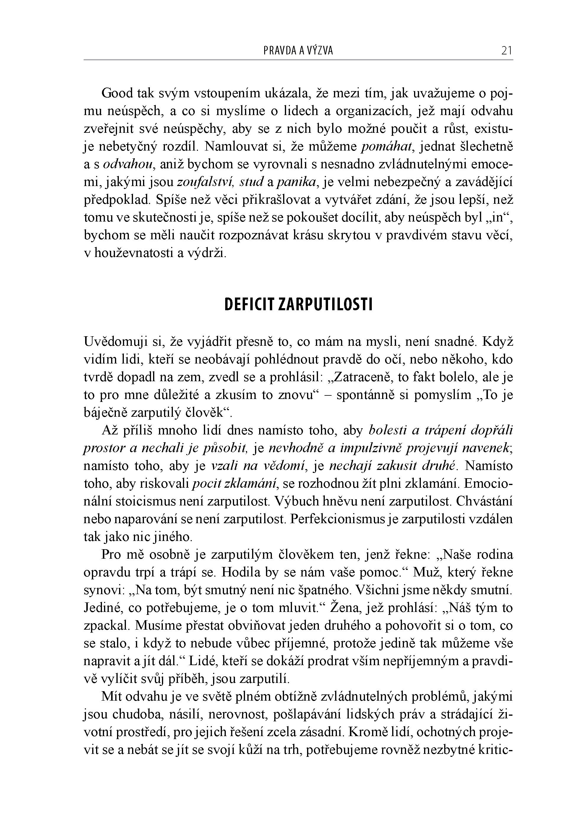 Knihou se jako červená nit táhne z hloubi našeho srdce a duše vyvěrající touha žít činorodým, kvalitním životem, prostoupeným nasazením, odhodláním a přesvědčením, že si zasloužíme lásku a přijetí ze strany druhých lidí. Docílit toho znamená rozvíjet a kultivovat odvahu, soucítění a napojení, abychom si ráno, když se probudíme, dokázali pomyslet: Bez ohledu na to, co všechno se dnes podaří a co ne, si zasloužím lásku a přijetí; znamená to si večer, když uléháme ke spánku, dokázat říci: Ano, nejsem dokonalý/á, jsem zranitelný/á a občas trpím obavami, to ale nic nemění na tom, že jsem ve skutečnosti odvážný/á a zasloužím si lásku, přijetí a pocit sounáležitosti s druhými lidmi