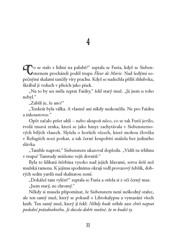 Svět bibliomantů je ohrožen novým děsivým nebezpečím. Jedno refugium za druhým je pohlcováno neznámou silou. Furia se obává, že je jediná, kdo může zastavit zničení světa – a že za to nejspíš bude muset zaplatit pořádně vysokou cenu. A potřebuje pomoc... Protože jestli se brzy nedostane z podivného mezisvěta, kam byla uvržena, nejspíš nezbyde žádný svět, kam by se mohla vrátit.