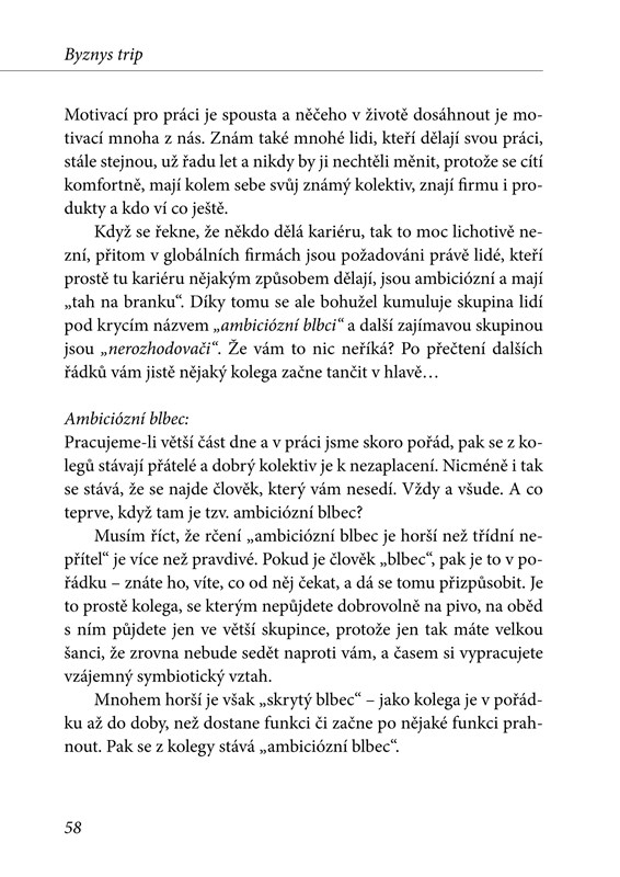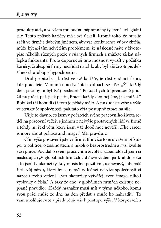 Je jedno, jestli jste mladý student, uvaděč v kině, ostřílený manažer nebo absolvent lesnické fakulty, který klepe na dveře personální agentury s chvějícím se hlasem a s rozšláplým koňským trusem na botě. Tato kniha je pro všechny a každý se v ní najde. Je i pro ty, kdo do profesního života ještě nevstoupili – najdou tu ochutnávku toho, co je čeká. Na pár stránkách, ryzí, bez cenzury, avšak s respektem a nadsázkou.