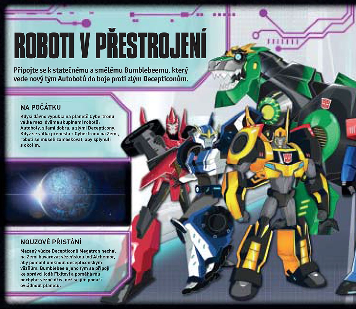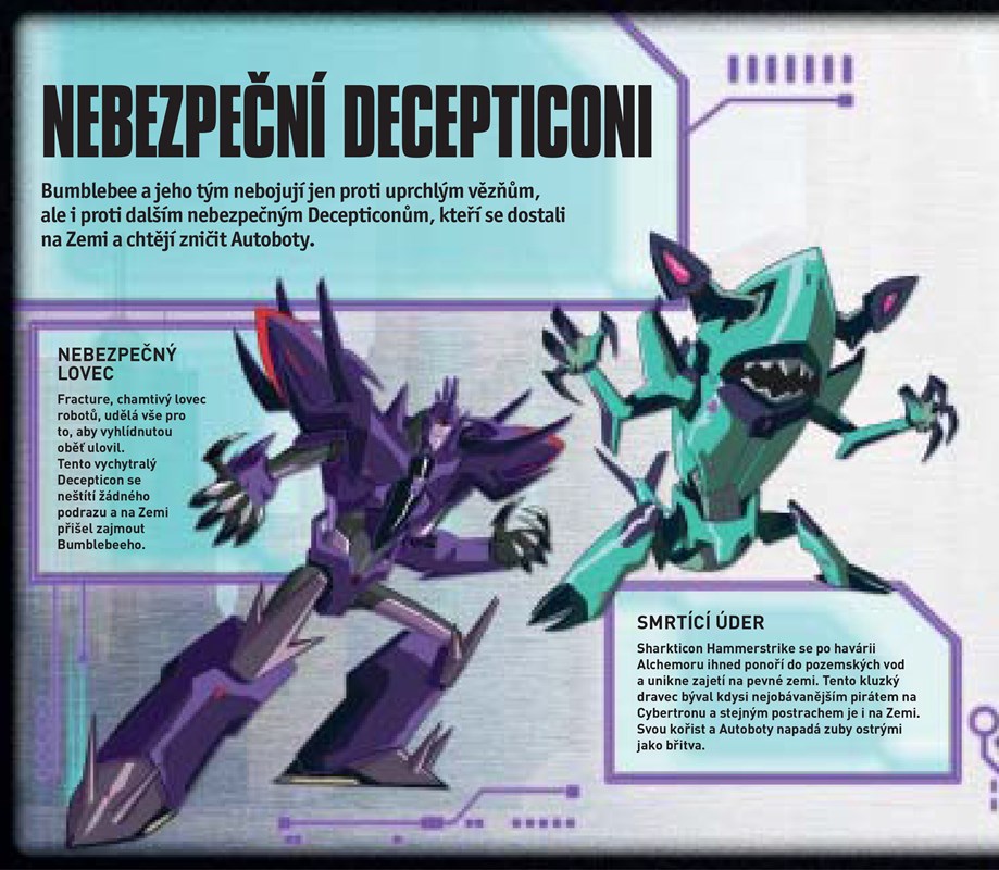 Vítejte v Crown City, městě, ve kterém se nyní odehrávají souboje mezi Autoboty a Decepticony. Poznejte Bumblebeeho a jeho jedinečný tým, který přiletěl na Zemi, aby pochytal Decepticony uprchlé z havarované vězeňské lodě. V tomto interaktivním průvodci najdete vše podstatné o svých oblíbených robotech. Skenujte ikonky – Transformeři se objeví na vašem displeji tak, jak jste je ještě nikdy neviděli! Použijte chytrý telefon, naskenujte ikonu z této knihy a probuďte oblíbeného Transformera k životu – a to vše třeba ve svém pokoji!