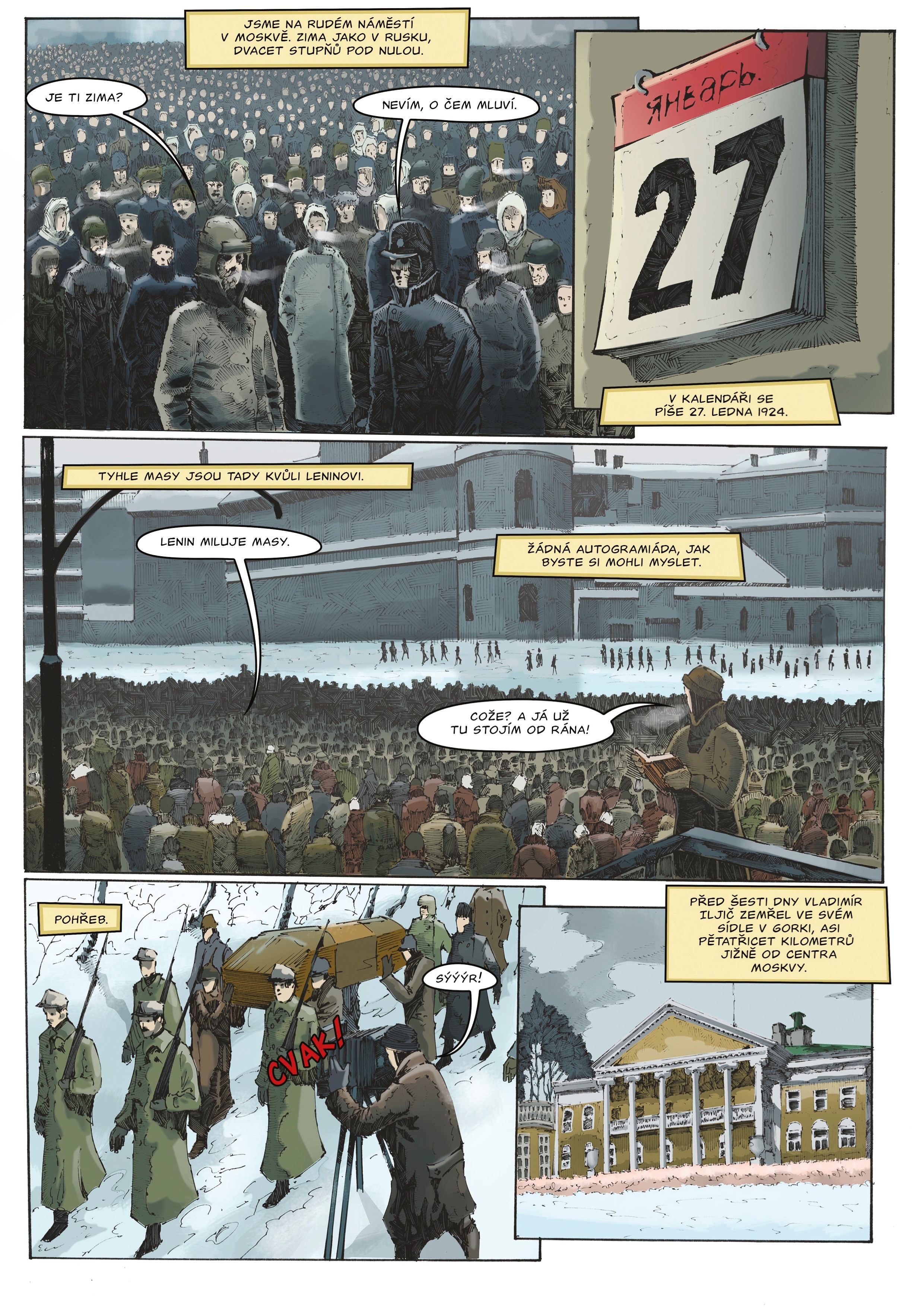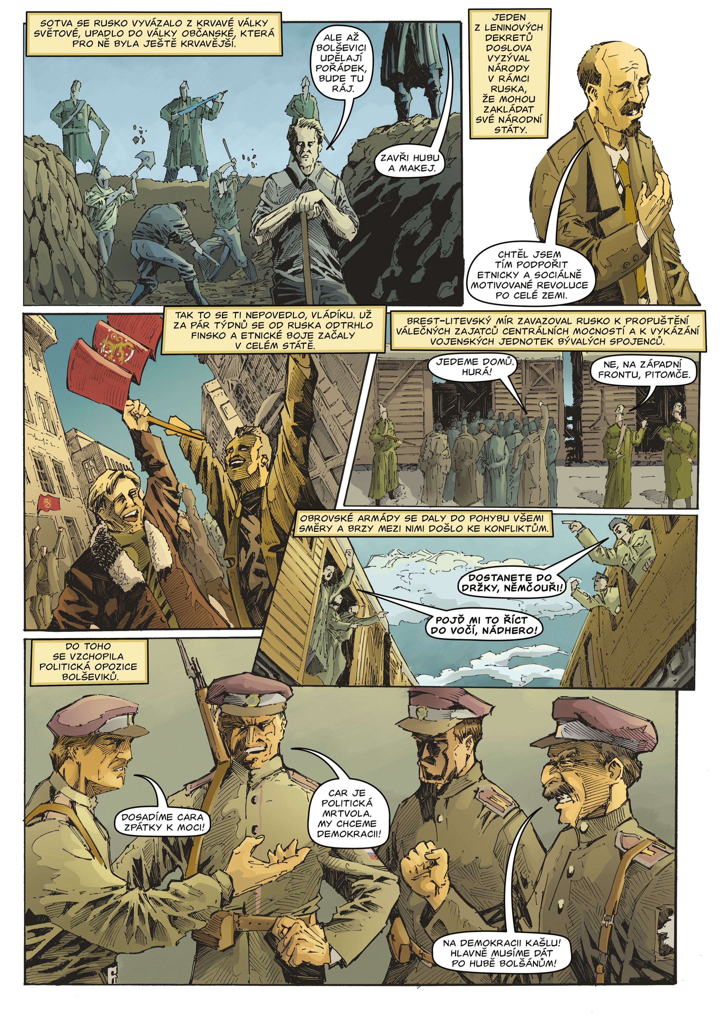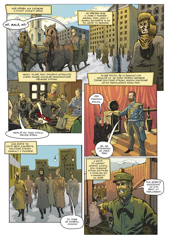 Už pár hodin po státním převratu v Rusku v říjnu 1917 začali bolševici vytvářet alternativní historii. Záměrně zkreslili fakta o své revoluci i o jejích aktérech. Cílem bylo udělat z převratu hrdinský čin, který má navíc podporu většiny ruského národa, a z aktérů neohrožené hrdiny ochotné za blaho lidu položit své životy. Revoluce přitom ve skutečnosti proběhla celkem hladce a měla podporu jen nevýznamného procenta obyvatelstva. Úpravou faktů bolševici dosáhli falešné legitimity své revoluce a sami si do rukou vložili mandát pro ovládnutí země. Tato alternativní fakta se pak celé následující století učila ve školách ve všech socialistických zemích včetně Československa. Komiks v této knize sleduje aktéry revoluce a jejich činy od konce 19. století až po Leninovu smrt. S ironickou nadsázkou provádí čtenáře událostmi v Rusku až po bolševickou revoluci, přitom se však drží historických faktů. Textová část knihy sleduje genezi a vývoj socialismu a z něho vzešlých ideologií, jako je komunismus nebo anarchismus. Zavede vás k Owenovi, Proudhonovi, Marxovi, Leninovi, k první i druhé internacionále i mezi pařížské komunardy.