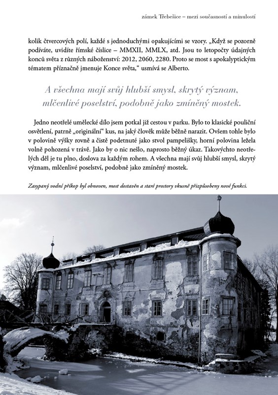Medailonky zámků, které jako bájní fénixové povstaly z popela, doplňují fotografie stavu před rekonstrukcí, v jejím průběhu a po případném dokončení.