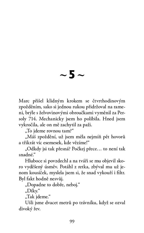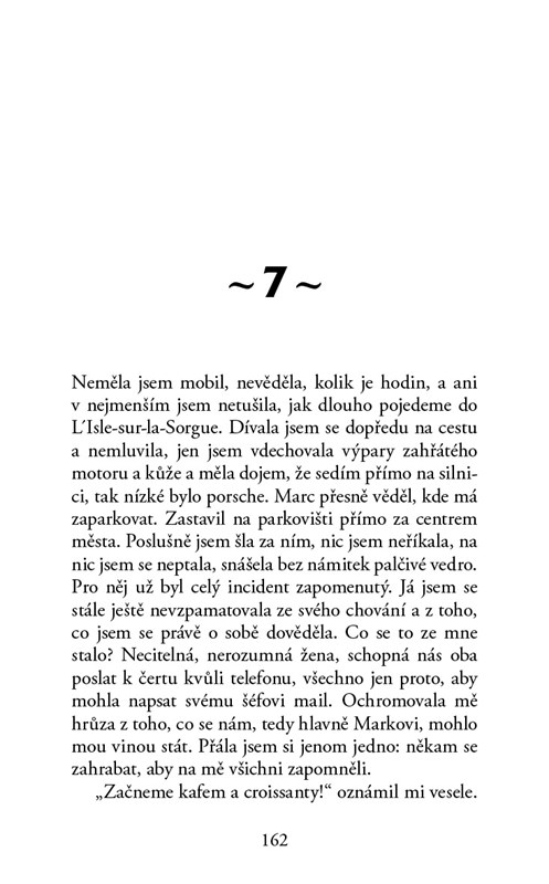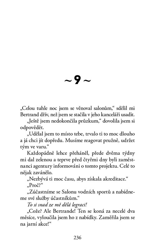 Díky úzké spolupráci se šéfem jsem se těšila úctě svých kolegů a také se mě obávali, což mi dokonale vyhovovalo. Zbožňovala jsem, když jsem dorazila na nějakou ekonomickou konferenci, kam jsem doprovázela klienta, a slyšela, jak si o mně šeptají, když jsem šla kolem nich; ano, záviděli mi, obávali se mě, dvořili se mi. Byla jsem v agentuře nejdéle. Marně jsem se snažila pochopit jejich důvody, proč opouštějí naši loď, doslova mě omračovalo pomyšlení, že dávají přednost volnému času, klukům a bůhvíčemu ještě před profesionálním životem. Jak můžou opustit takovýhle džob!