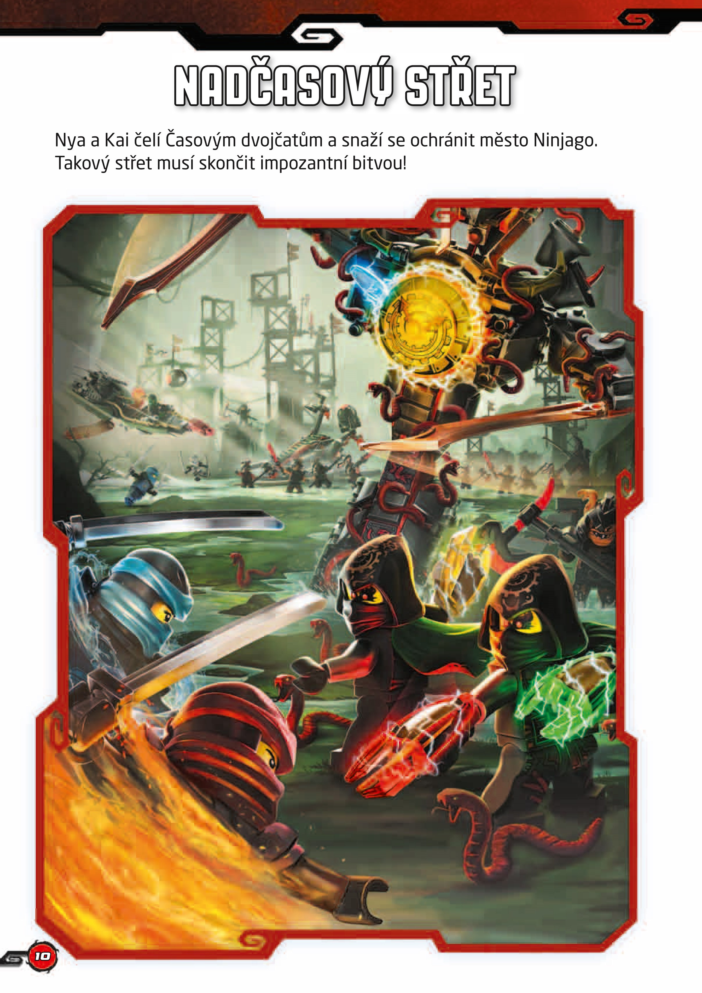 Mistra Wu dostihnou jeho minulé souboje a Kai, Nya, Jay, Cole, Zane a Lloyd teď musejí bojovat s novými nepřáteli – Časovými dvojčaty. Společně s armádou brnění, která ovládají hadi, a schopností manipulovat časem plánují Časová dvojčata změnit minulost i budoucnost. Aby nindžové zachránili město Ninjago, potřebují spojit své síly. Vyřeš úkoly, přečti si komiks a sestav minifigurku slizkého Rumělkového válečníka.